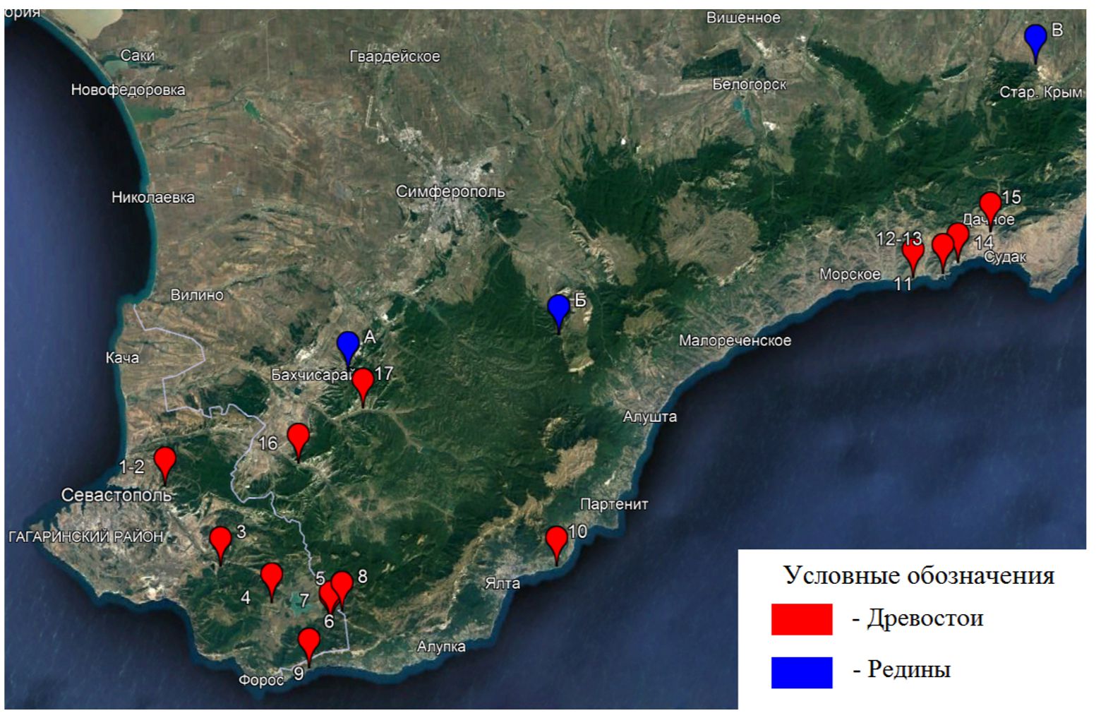 Рис. 1 Схема расположения исследуемых территорий в Горном Крыму: (Древостои: 1-2 – окрестности г. Инкерман; 3 – г. Чирка-Каясы; 4 – г. Самналых; 5 – г. Толака-Баир; 6–8 – г. Кара-Даг; 9 – г. Дракон; 10 – м. Мартьян; 11 – г. Папая-Кая; 12–13 – г. Коба-Кая; 14 – г. Сокол; 15 – г. Каршитерс; 16 – ск. Куллю-Кая; 17 – окрестности с. Кудрино. Редины: А – г. Беш-Кош; Б – г. Чатыр-Даг; В – г. Лысый Агармыш)