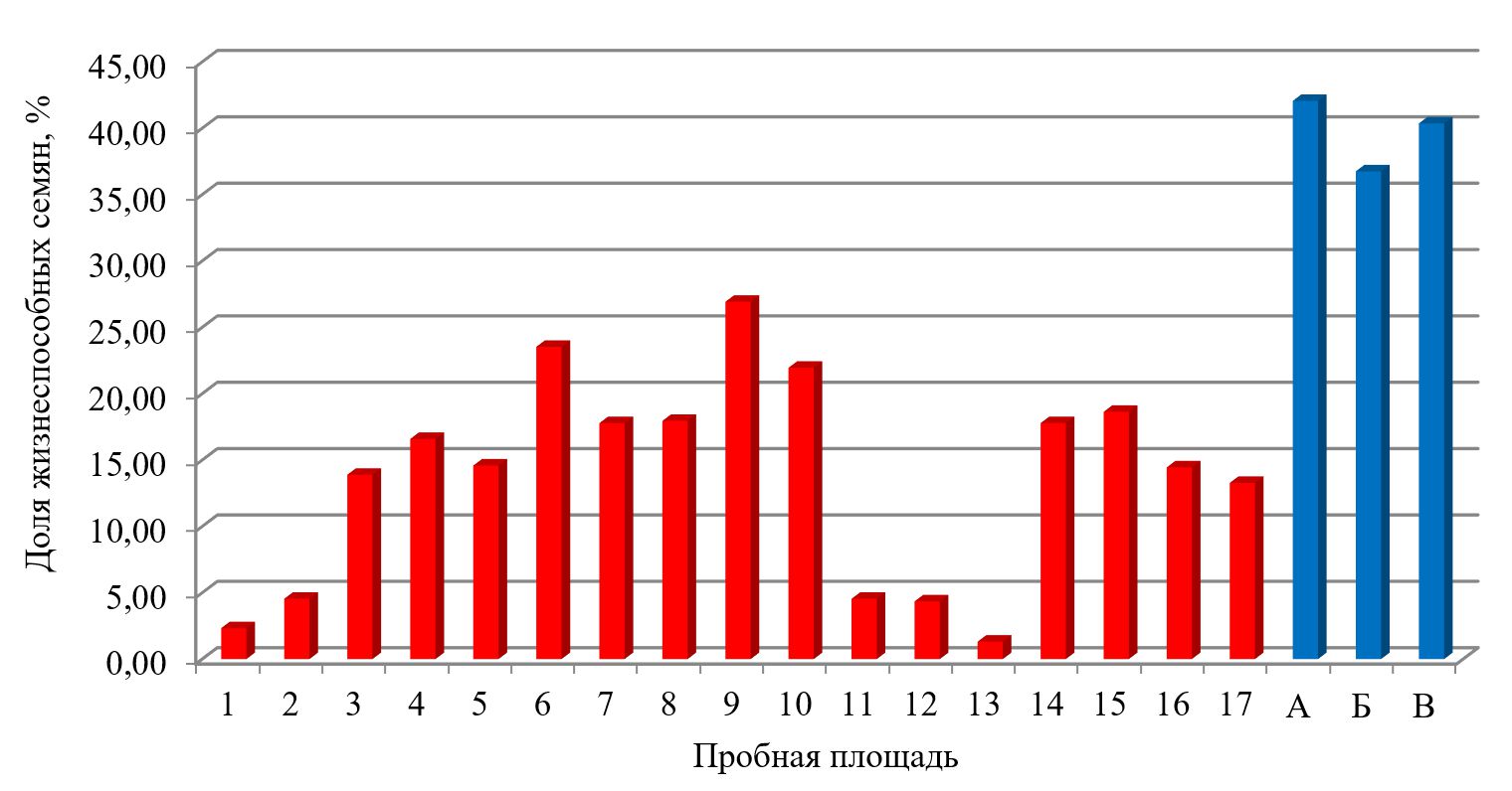 Рис. 3. Доля жизнеспособных семян J. deltoides в пределах пробных площадей (красный цвет – древостои; синий – редины)