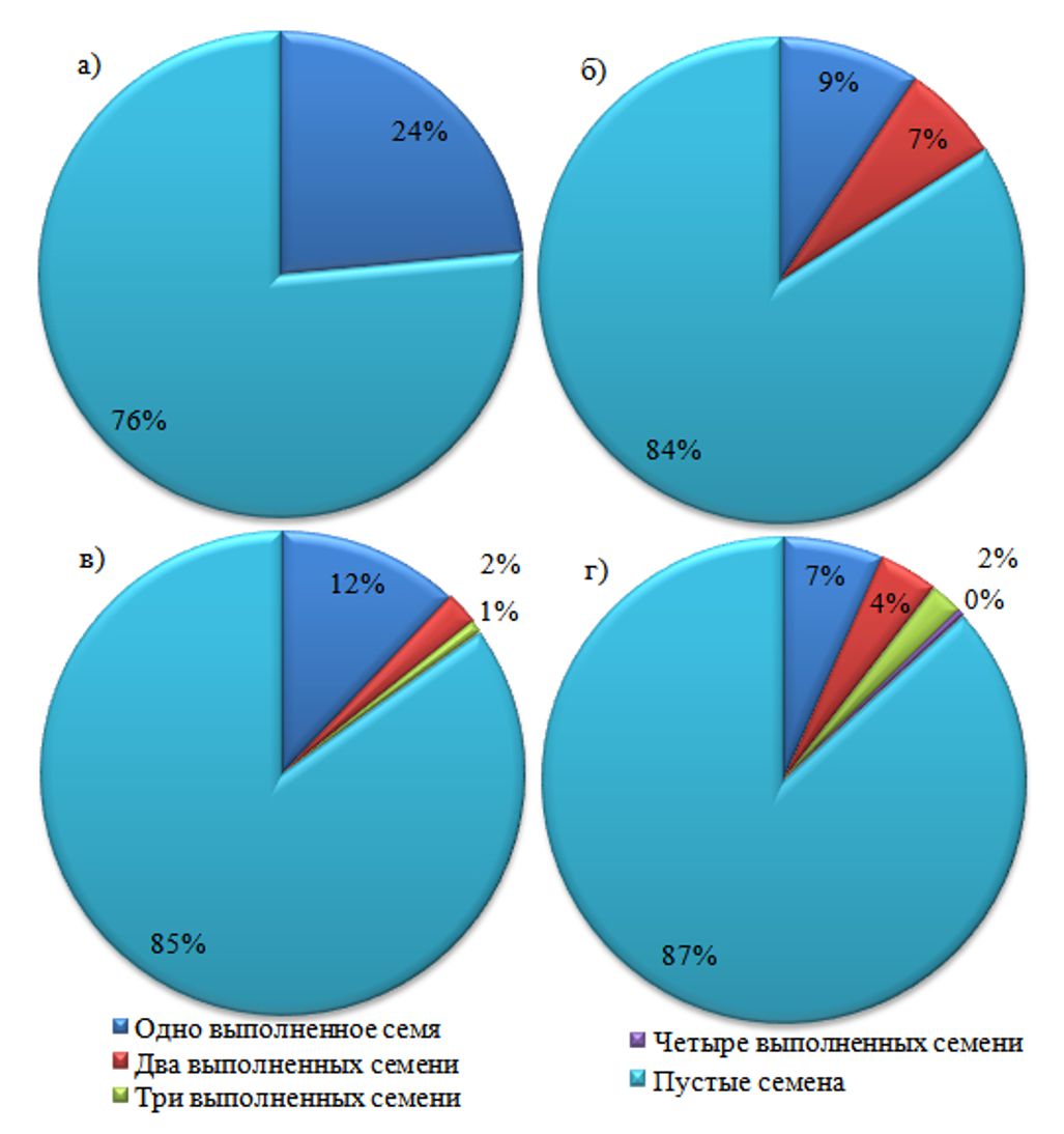 Из рисунка 4 видно, что в подавляющем большинстве случаев в шишкоягодах образуется одно полноценное семя, на долю которых приходится от 6,62% (в шишкоягодах с четырьмя семенами) до 23,53% в односемянных шишкоягодах. Данную закономерность необходимо учитывать при подсчете необходимого количества шишкоягод при искусственном восстановлении можжевеловых насаждений в Горном Крыму.
