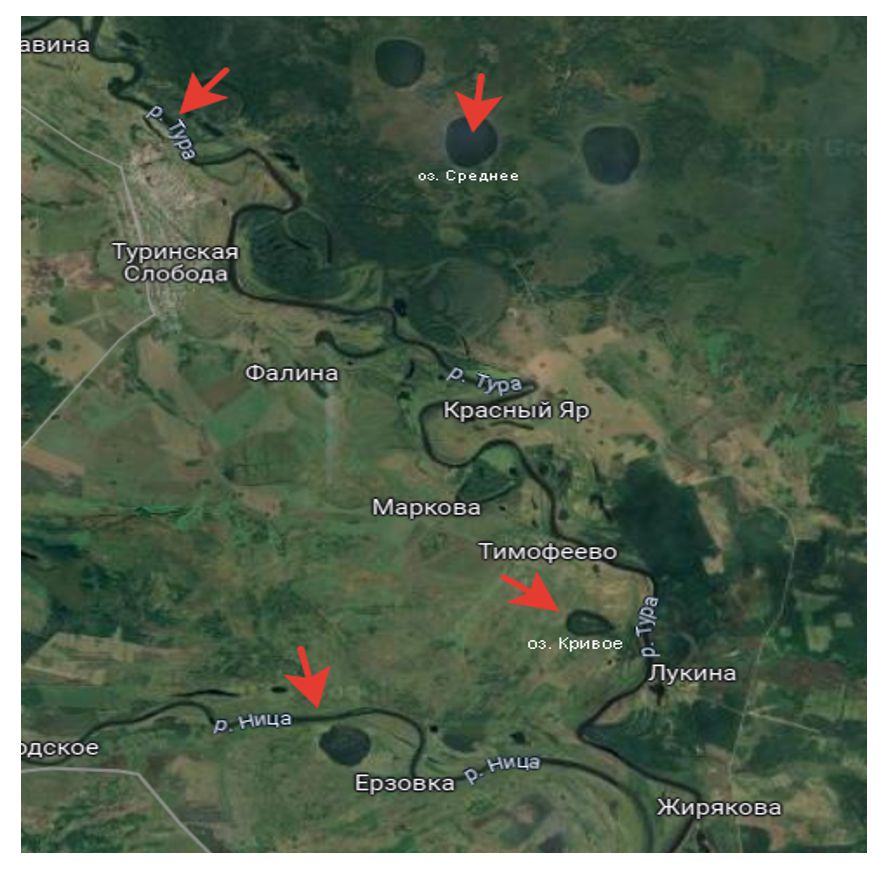р. Ница – 57º51ʹ93.6ʺN, 64º43ʹ51.7"E; оз. Кривое – 57º53ʹ87.7ʺN, 64º51ʹ20.2"E оз. Среднее – 57°38'15.9"N, 64°28'50.9"E.