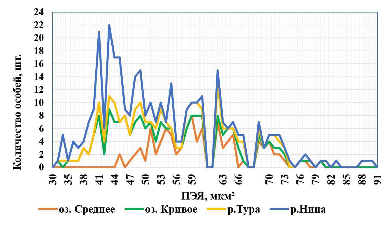 Также в область неопределенности ПЯЭ (от 62,0 мкм2 до 67,1 мкм2) в популяциях серебряного карася попали особи из каждого исследуемого водоема. Наибольшее число неопределенных особей оказалось в выборке из оз. Среднее – 18 экземпляров.