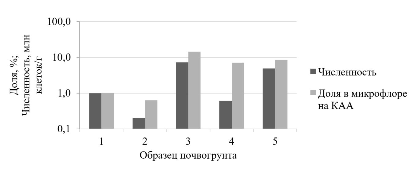 Количество микроорганизмов, растущих на среде с минеральным азотом, варьировалось от 31,9 до 99,3 млн КОЕ/г для образцов №№ 1, 2, 3, 5. В образце №4 их количество также было минимальным и составило 8,7 млн КОЕ/г. Так, количество микроорганизмов, растущих на КАА, варьируется в пределах от 15,6 до 36,6 % от общей численности. Количество сапрофитов и растущих на КАА сопоставимо во всех образцах.