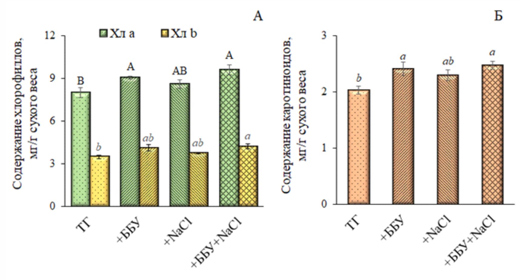 Одним из индикаторов ответной реакции растений на условия произрастания является состояние пигментного комплекса, которое зависит от содержания и соотношения фотосинтетических пигментов [20]. При внесении ББУ (отдельно или совместно с NaCl) содержание хлорофиллов и каротиноидов в среднем увеличивалось на 20% (рис. 2).