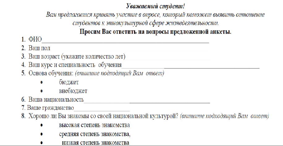 Рис. 4. Пример анкеты по выявлению отношения обучающихся к проживанию в поликультурной среде