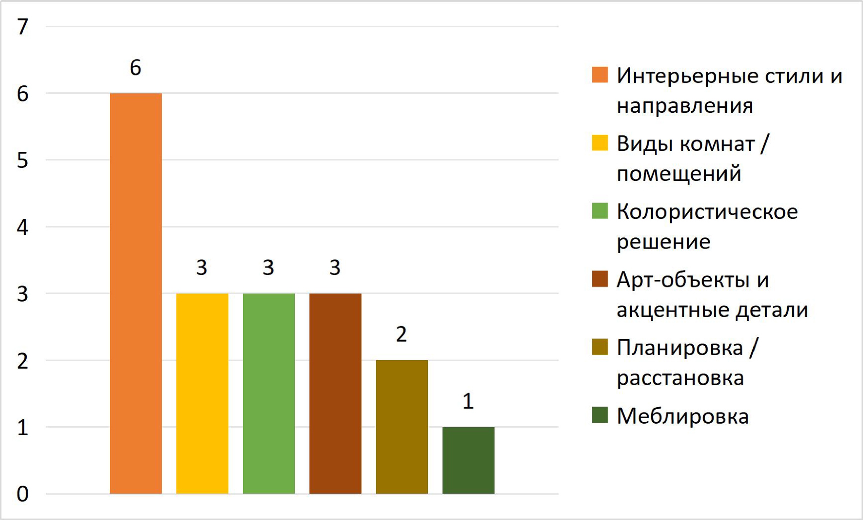 Тематическая стратификация неологизмов продемонстрировала динамику современных интерьерных концепций, где доминирует группа, связанная со стилевыми направлениями. Менее представленные группы («Виды помещений», «Колористика», «Арт-объекты», «Планировка», «Меблировка») отражают узкоспециализированные, но значимые аспекты дизайна, требующие терминологического закрепления.