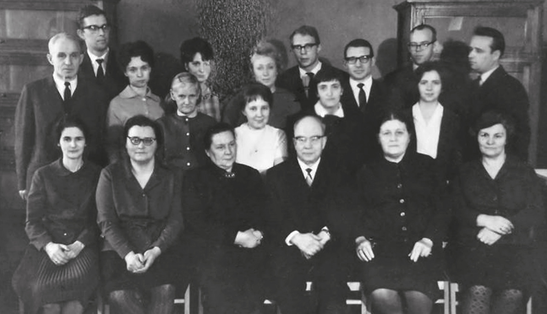 Рис. 5. Н.А. Шевченко (в центре, первый ряд) в составе коллектива кафедры гистологии Первого Ленинградского медицинского института им. И.П. Павлова, 1969 год: 1-й ряд: Л.Р. Сапожникова — ассистент, В.Ф. Самсонова — ассистент, Н.Е. Васильева — доцент, Н.А. Шевченко — заведующий кафедрой, Н.И. Поркшеян — ассистент, […]; 2-й ряд: С.М. Горелик — лаборант, […],[…],[…], Д.Д. Аравийская — аспирант, Л.В. Четвертакова — ассистент, О.Г. Ляшко — препаратор; 3-й ряд: В.П. Сухинин — совместитель, […], Г.Т. Зуева — материально ответственное лицо, В.П. Анисимов — совместитель, В.Г. Гололобов — аспирант, В.В. Глинчиков — ассистент, В.И. Берташ — ассистент.