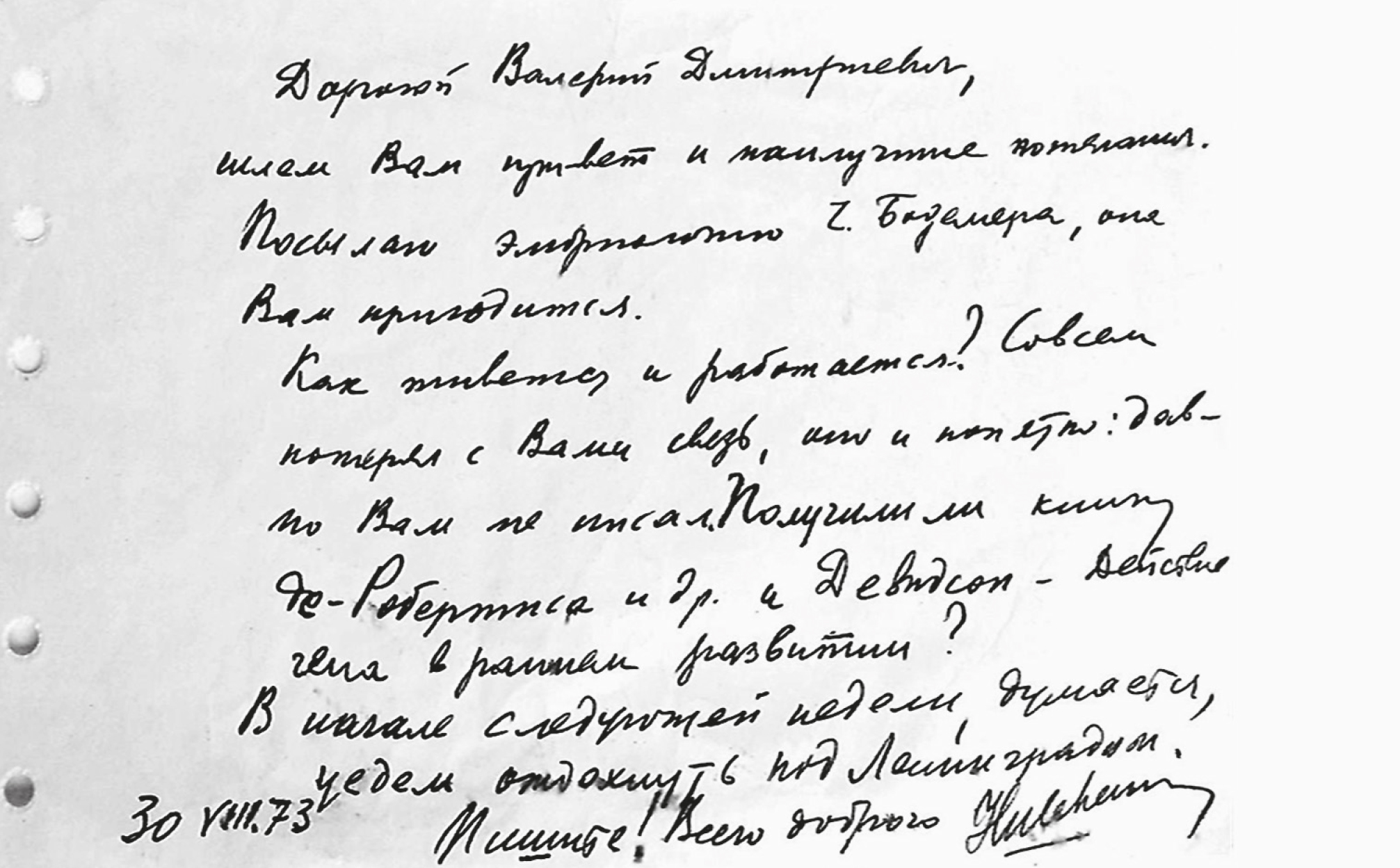 Николай Антонович по-отечески заботился о том, чтобы ученики, закончив аспирантуру, не теряли набранной высоты и продолжали совершенствовать свои научные и педагогические умения. С неизменной глубокой благодарностью привожу текст одного из его писем: «Дорогой Валерий Дмитриевич1, шлём Вам привет и наилучшие пожелания. Посылаю эмбриологию Ч. Бодемера, она Вам пригодится. Как живется и работается? Совсем потерял с Вами связь, оно и понятно: давно Вам не писал. Получили ли книгу де-Робертиса и др. и Девидсон2 «Действие гена в раннем развитии»? В начале следующей недели, думается, уедем отдохнуть под Ленинградом. Пишите! Всего доброго, Н. Шевченко. 30.VIII.73» (рис. 8)3.