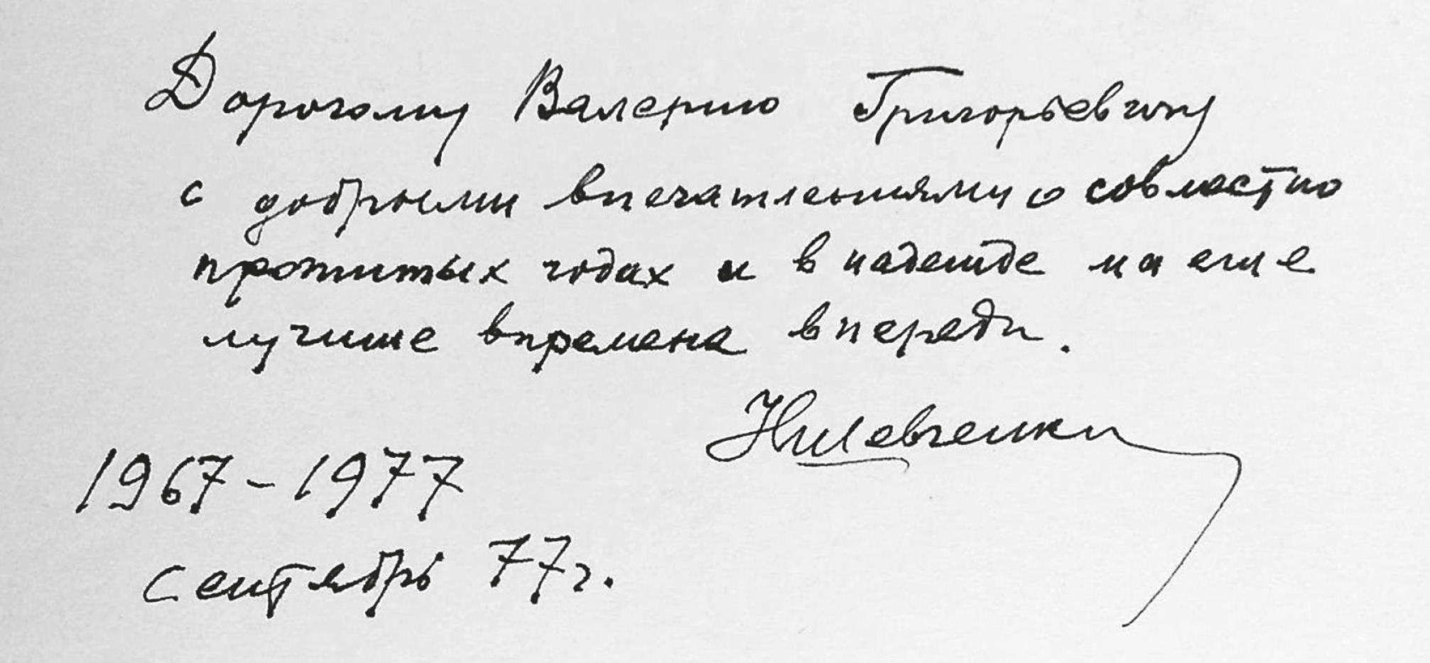 Об уважительном и доброжелательном отношении учителя к своему ученику красноречиво свидетельствует надпись, сделанная на обороте фотографии, подаренной соавтору: «Дорогому Валерию Григорьевичу с добрыми впечатлениями о совместно прожитых годах и в надежде на ещё лучшие времена впереди. 1967–1977. Н. Шевченко. Сентябрь 77 г.» (рис. 9).