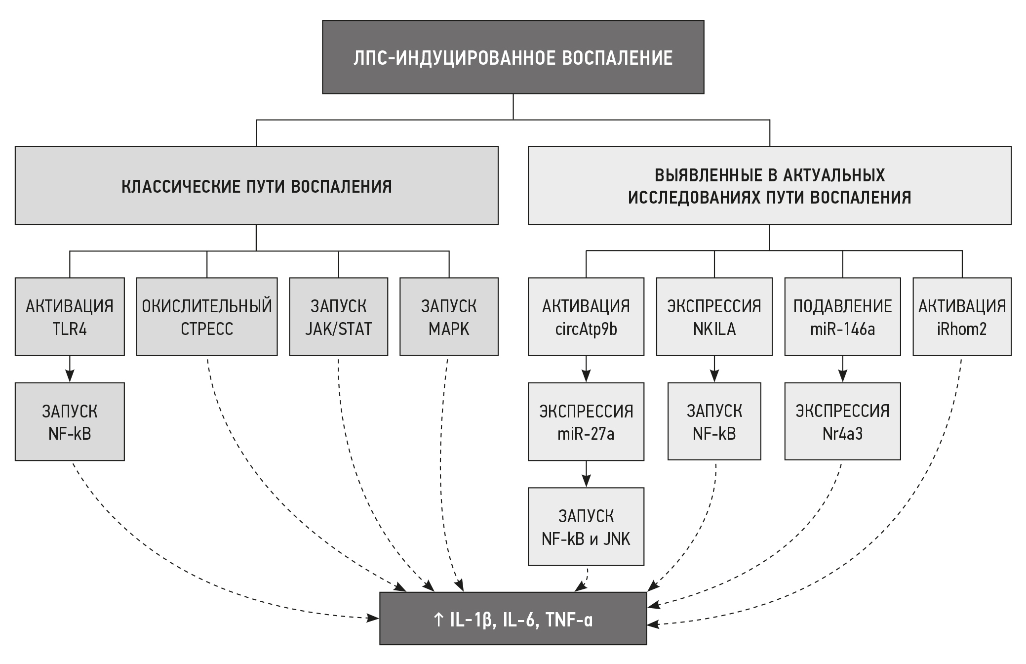 Проведённый анализ литературных данных по ЛПС-индуцированной модели воспаления подтвердил, что в основе развития воспалительного процесса лежит активация классических сигнальных путей NF-κB, MAPK и JAK/STAT. При этом некоторые исследования раскрывают участие других молекулярных механизмов в патогенезе воспаления: влияние некодирующих и циркулярных РНК, роль белка iRhom2 и TRPV1, паракринные эффекты клеток иммунной системы и т.д. (рис. 1).