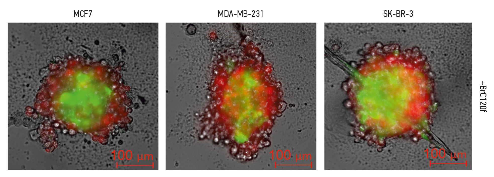 Для подтверждения включения клеток обоих типов — опухолевых и стромальных — в состав гетерогенных сфероидов, образующихся при культивировании на планшетах Nunclon™ Sphera™, использовали линии опухолевых клеток MCF7, MDA-MB-231 и SK-BR-3, продуцирующие красный флуоресцентный белок (mKate2), и клетки BrC120f, продуцирующие зелёный флуоресцентный белок (eGFP). Флуоресцентная микроскопия показала, что в состав сфероидов входят оба типа клеток — фибробласты и опухолевые клетки (рис. 3). Фибробласты преимущественно формируют внутренний каркас, а опухолевые клетки располагаются на периферии.