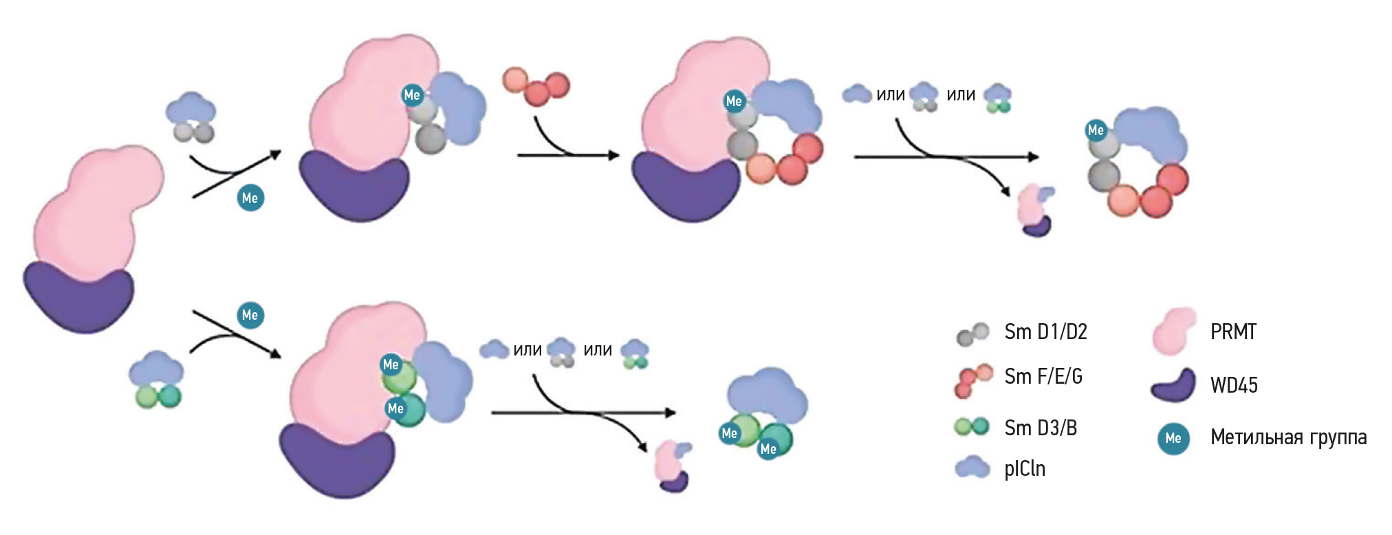 На раннем этапе сборки (рис. 2) проходит подготовка Sm-белков к началу сборки snRNP-ядра при помощи комплекса протеин-аргинин-метилтрансферазы 5 (protein arginine methyltransferase 5, PRMT5), состоящего из PRMT, WD45 (белок, необходимый для образования комплекса PRMT5) и pICln (белок, связывающий Sm-белки с комплексом PRMT5) [15]. Сперва комплекс pICln с Sm D1/D2 связывается с PRMT5, после чего метилируется белок Sm D1 и присоединяется Sm F/E/G с образованием гексамерного комплекса pICln/D1(met)/D2/F/E/G (комплекс 6S). Комплекс 6S вытесняется молекулами pICln, pICln/D1/D2 или pICln/D3/B.