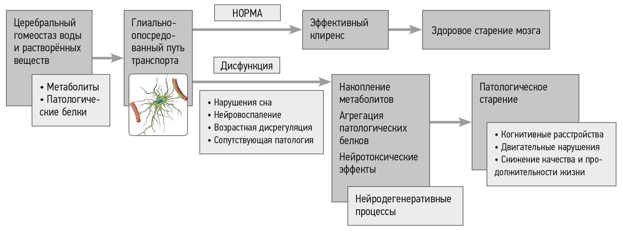 Таким образом, связанные с возрастом изменение циркадианных ритмов и снижение скорости обмена церебральной жидкости могут способствовать падению эффективности клиренса метаболитов в стареющем головном мозге. С учётом критической роли глимфатической системы в поддержании церебрального гомеостаза дисфункция этого глиально-опосредованного транспорта имеет значительные последствия [12–15]. Потенциальная роль глимфатической системы в мозговой гидродинамике, особенности её функционирования в возрастном аспекте и возможные нарушения в процессе старения актуализируют глубокое и многостороннее изучение этой системы во взаимосвязи с патогенезом нейродегенеративных протеинопатий, характеризующихся аномальной агрегацией белков и недостаточным удалением нейротоксических метаболитов.
