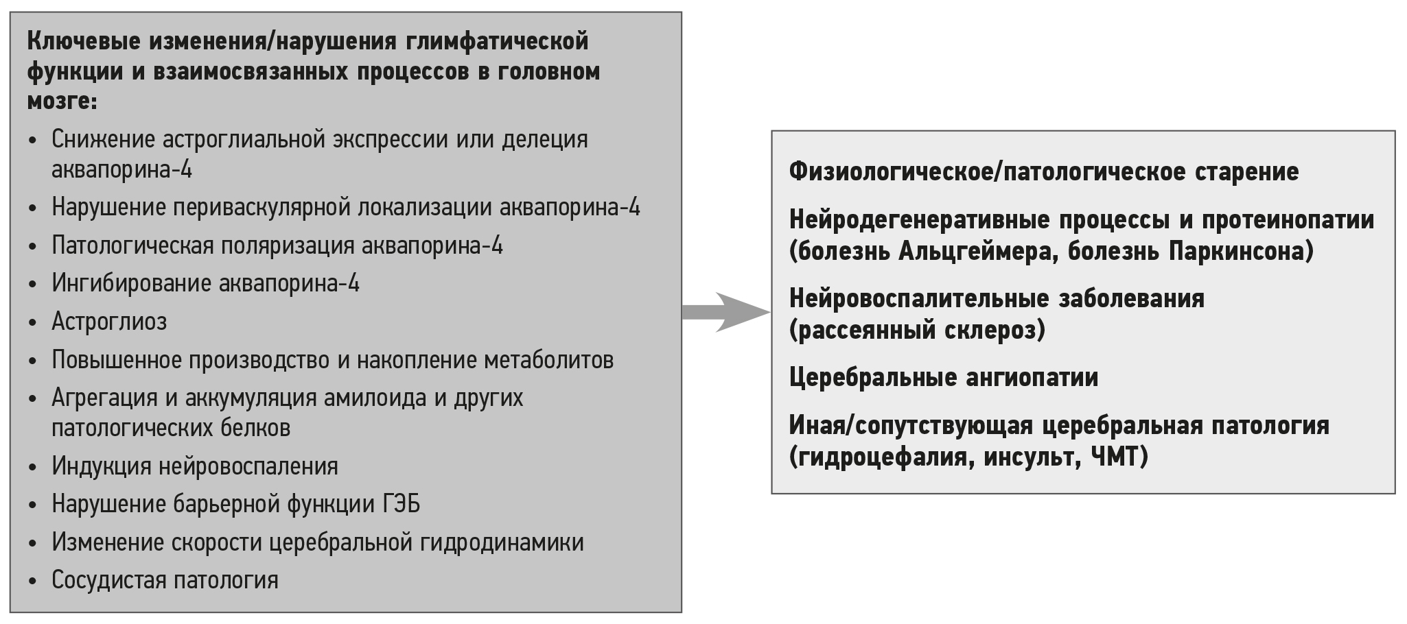 В исследованиях установлено нарушение глимфатической функции у трансгенных мышей при моделировании ключевых патологических событий других НЗ, как, например бокового амиотрофического склероза, или в мышиной модели, экспрессирующей гентингтин (болезнь Гентингтона). Помимо нейродегенеративных процессов, также сообщалось об изменениях в глимфатической системе и экспрессии аквапорина-4 как основной её детерминанты при гидроцефалии, инсульте, черепно-мозговой травме, церебральной амилоидной ангиопатии, рассеянном склерозе, сахарном диабете и других патологиях. В частности, показано, что черепно-мозговая травма, являясь фактором риска НЗ, способствует развитию тау-патологии на модели мышей с дефицитом аквапорина-4 [79–81]. Астроглиальный водный канал сверхэкспрессирован в месте инфаркта при ишемическом инсульте, а отложения фибрина и фибриногена способствуют окклюзии периваскулярных пространств при геморрагическом инсульте [4, 44, 64]. В целом дисрегуляция клиренса метаболитов, ассоциированная с возрастом и накоплением амилоидогенных белков, может быть в полной мере экстраполирована на любые экспериментальные модели нейродегенерации, поскольку одинаковым образом связана со снижением глимфатического транспорта жидкости [10, 34, 82–84] (рис. 2).
