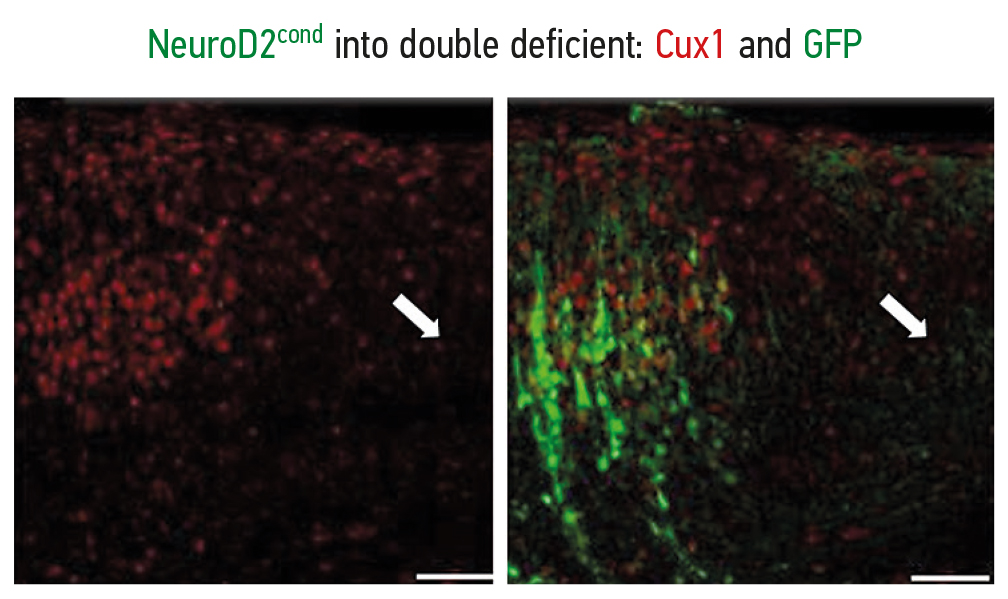 Рис. 3. NeuroD2/6 действует на клетку автономно, контролируя экспрессию Cux1. Экспрессия Cux1 восстанавливается в клетках, электропорированных NeuroD2 в мозге с двойным нокаутом: иммунофлуоресцентное окрашивание на зеленый флуоресцентный белок (GFP) (NeuroD1, зелёный канал) и Cux1 (красный канал). Стрелки указывают на отрицательную область Cux1 в мозге с двойным нокаутом. In utero электропорация была выполнена на 13-й день эмбрионального развития, а мозг зафиксирован на 18-й день эмбрионального развития. Бар — 100 мкм.