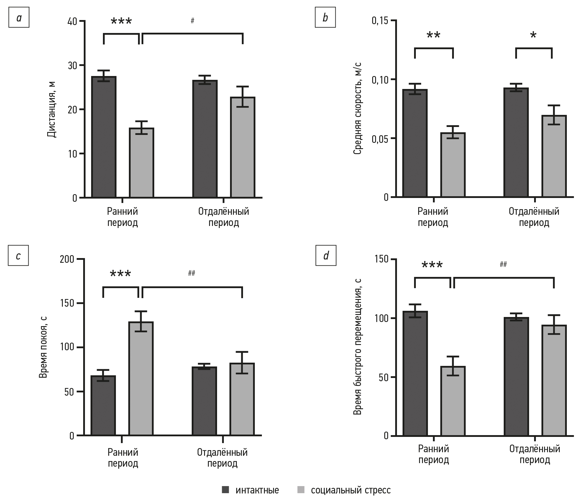 Рис. 2. Общая двигательная активность мышей линии C57Bl/6 после моделирования хронического социального стресса в инфантильном возрасте в тесте «Открытое поле»: а — дистанция, пройденная животным за время теста; b — средняя скорость; c — общее время покоя; d — общее время быстрого перемещения; *, **, *** статистически значимое отличие от значений интактной группы (p <0,05; p <0,001; p <0,0001 соответственно); #, ## статистически значимое различие между значениями группы социального стресса в раннем и отдалённом периодах (p <0,05; p <0,01 соответственно).