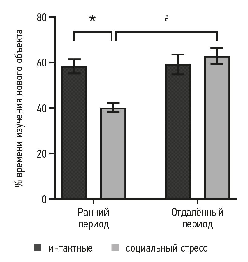 Рис. 7. Исследование памяти мышей линии C57Bl/6 после моделирования хронического социального стресса в инфантильном возрасте в тесте «Новый объект»; * статистически значимое отличие от значений интактной группы (p <0,01); # статистически значимое различие между значениями группы социального стресса в раннем и отдалённом периодах (p <0,0001).