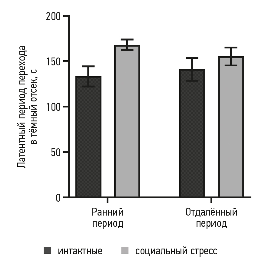 Исследование рабочей памяти при формировании условного рефлекса пассивного избегания после моделирования хронического социального стресса в раннем периоде показало тенденцию к увеличению латентного периода перехода в тёмный отсек по сравнению с интактной группой (рис. 8). Высокие показатели рабочей памяти сохранялись и в отдалённом периоде, статистически значимых отличий от интактной группы также не выявлено.