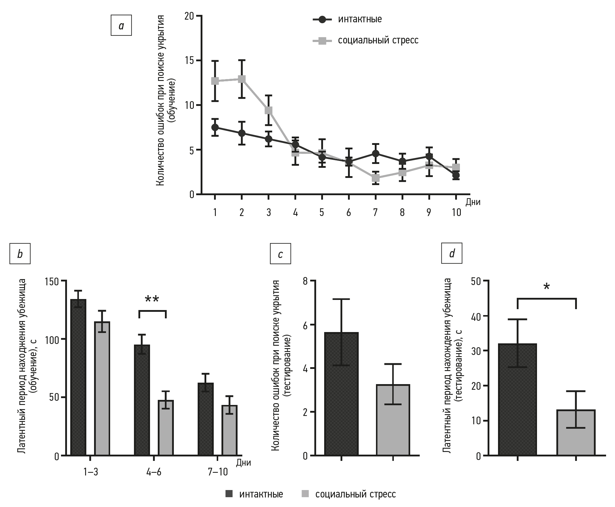 Рис. 9. Исследование пространственного ориентирования мышей линии C57Bl/6 после моделирования хронического социального стресса в инфантильном возрасте в тесте «Лабиринт Барнс»: а — количество ошибок при поиске убежища на этапе обучения; b — латентный период нахождения убежища на этапе обучения; c — количество ошибок при поиске убежища на этапе тестирования формирования долговременной памяти; d — латентный период нахождения убежища на этапе тестирования формирования долговременной памяти; *, ** статистически значимое отличие от значений интактной группы (p <0,05; p <0,001 соответственно).
