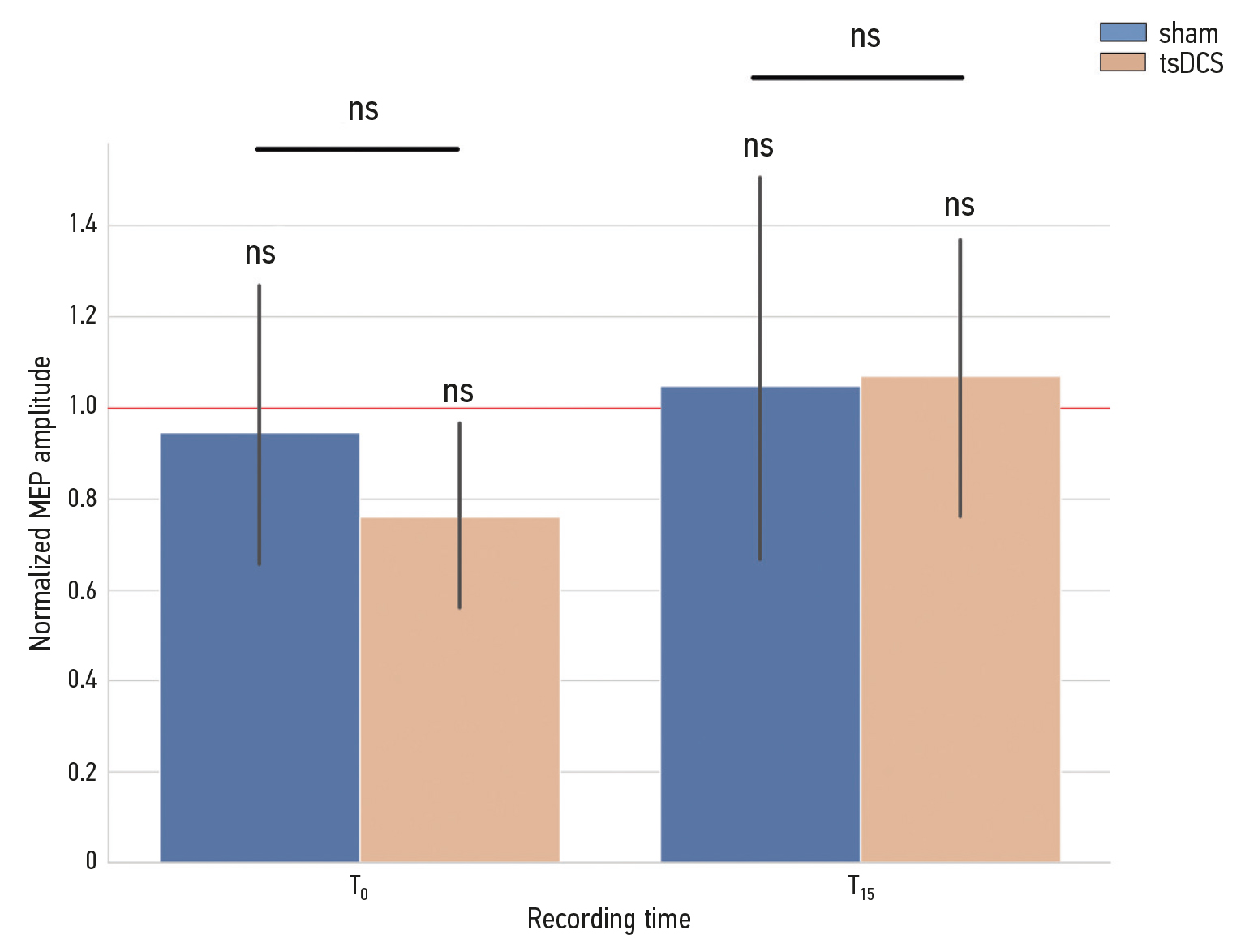 Fig. 1. MEP (motorevoked potentials) amplitudes normalized by prestimulation (Tbefore) values for groups receiving tsDSC and sham stimulation. The MEPs are recorded immediately after the stimulation (T0) and within a 15-min delay (T15). Error bars represent 95% CI of the estimates (ns, not significant).