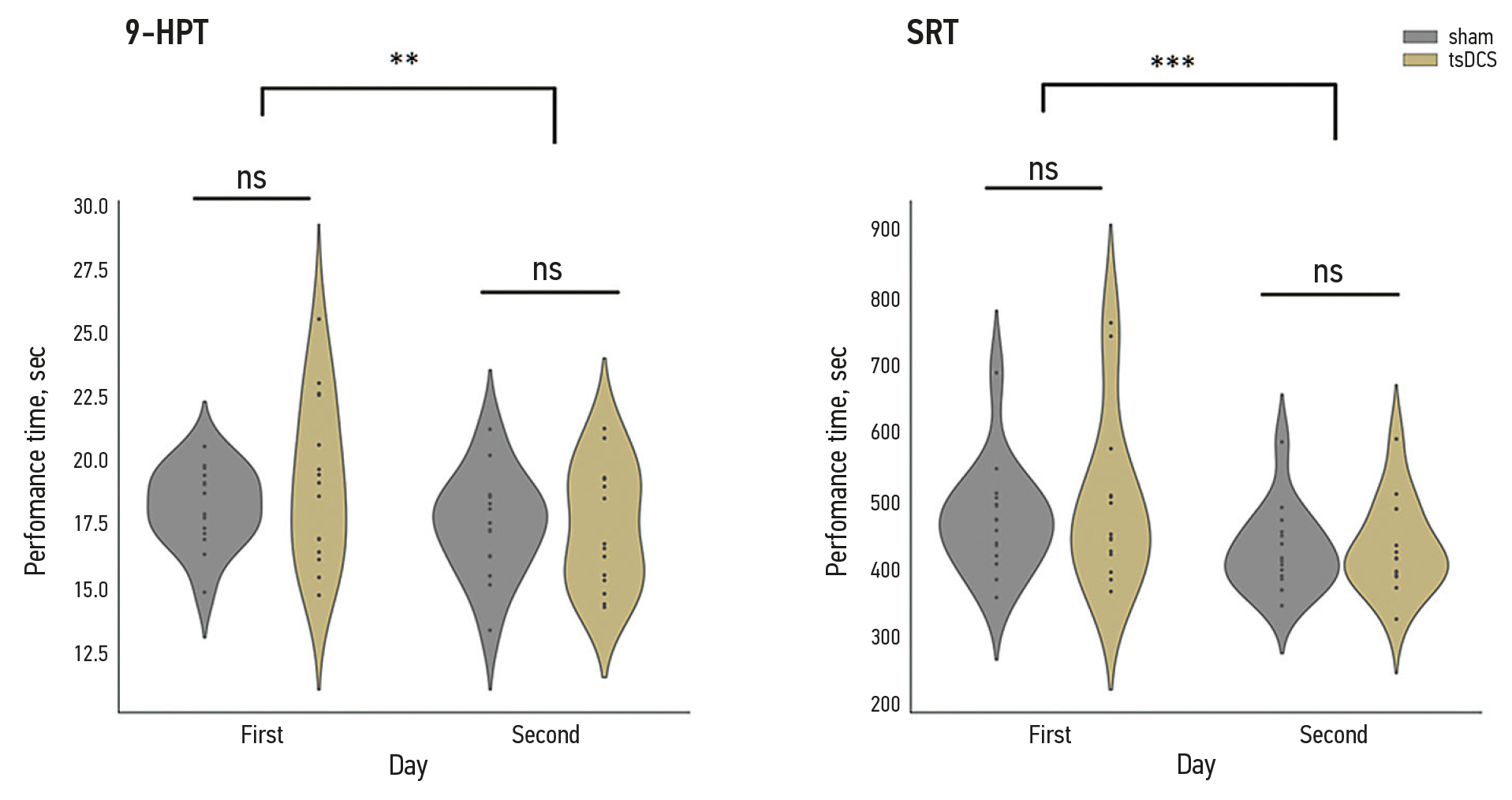 Fig. 2. Performance timing of participants receiving anodal tsDSC and sham stimulation assessed separately for the nine-hole peg test (9-HPT) and the serial reaction time task (SRT). No significance was observed for the group factor indicated by the special symbols between bars (ns, p >0.05, not significant). The special symbols between groups of bars indicate the significance of the day factor in the two ANOVA models; ** p <0.01; ***p <0.001).