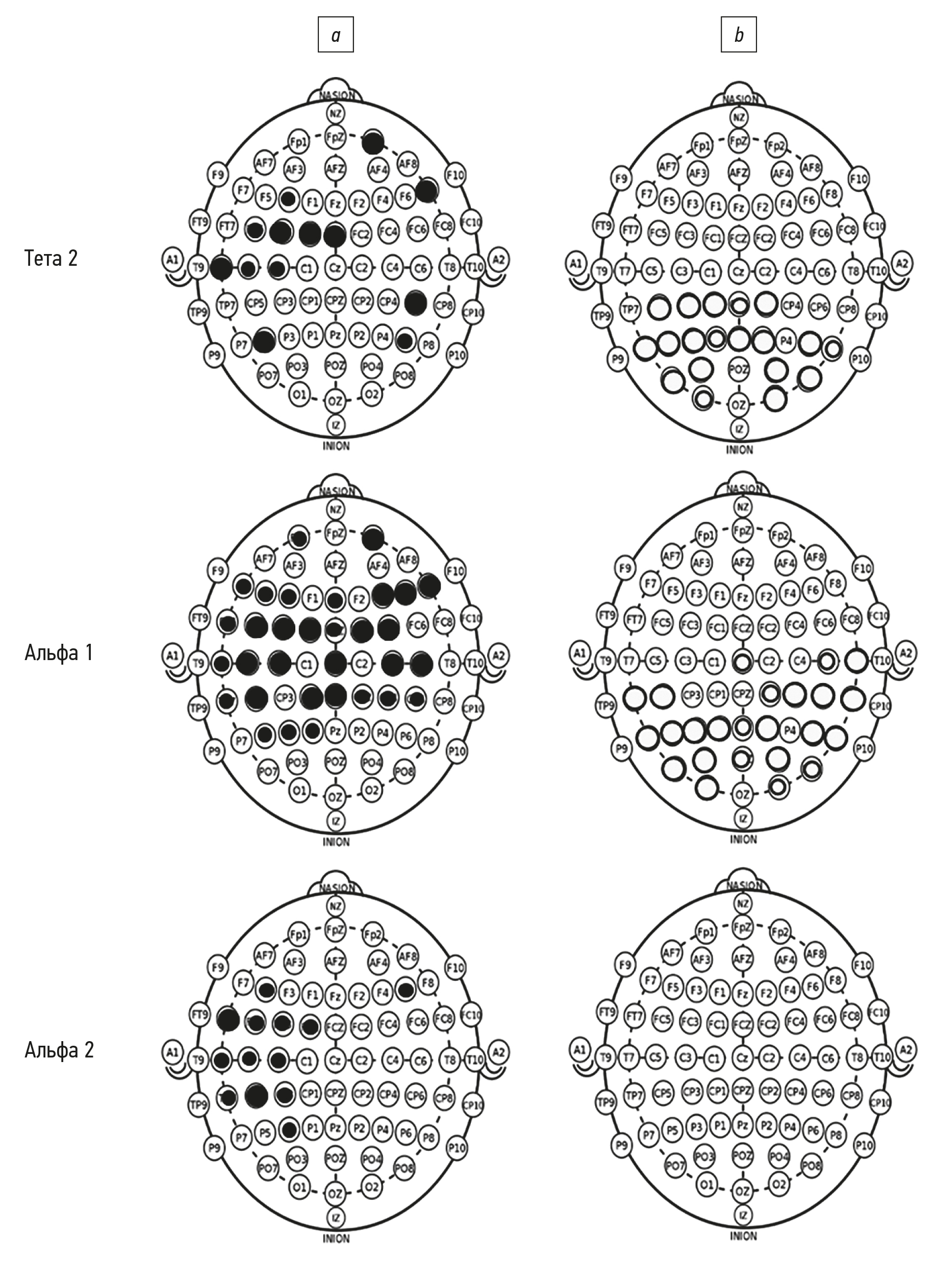 Рис. 1. Карты корреляций между компонентом эмоционального интеллекта, отражающим использование эмоций в принятии решения, и регионарными показателями мощности тета 2-ритма, альфа 1-ритма 1 и альфа 2-ритма в группах мужчин (a) и женщин (b) — пациентов кардиологической клиники. Чёрные кружки — положительные корреляции, светлые — отрицательные корреляции, размер кружков соответствует уровню 0,001< р <0,05 (см. табл. 2).