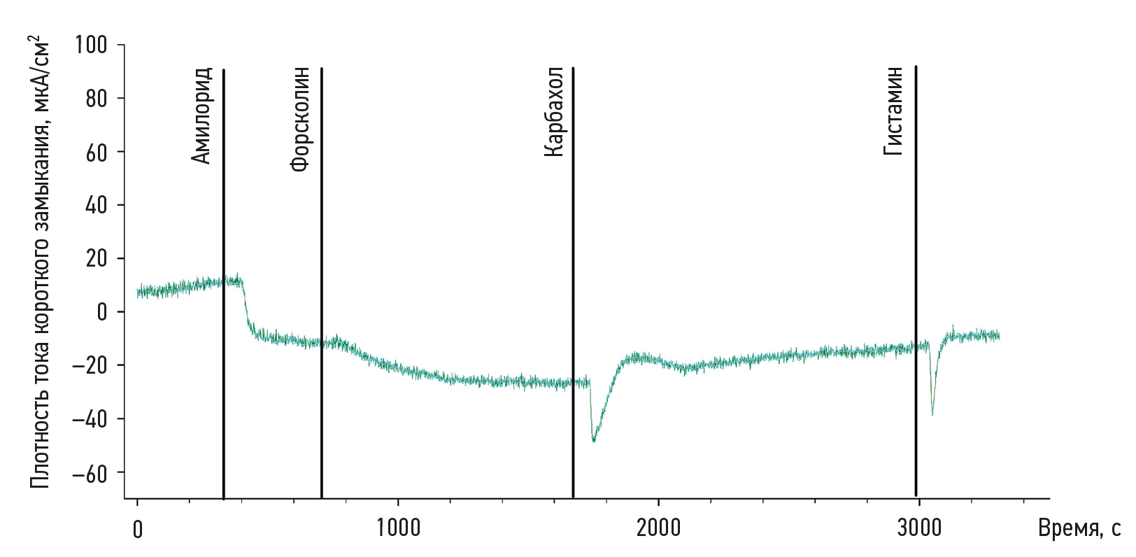 Рис. 2. Результаты измерения плотности тока короткого замыкания у здорового добровольца с функциональным CFTR-каналом (отрицательный контроль). При введении амилорида происходило снижение тока короткого замыкания, в ответ на форсколин — значительное увеличение ΔISC, а при добавлении карбахола и гистамина отмечено изменение тока короткого замыкания в положительную сторону