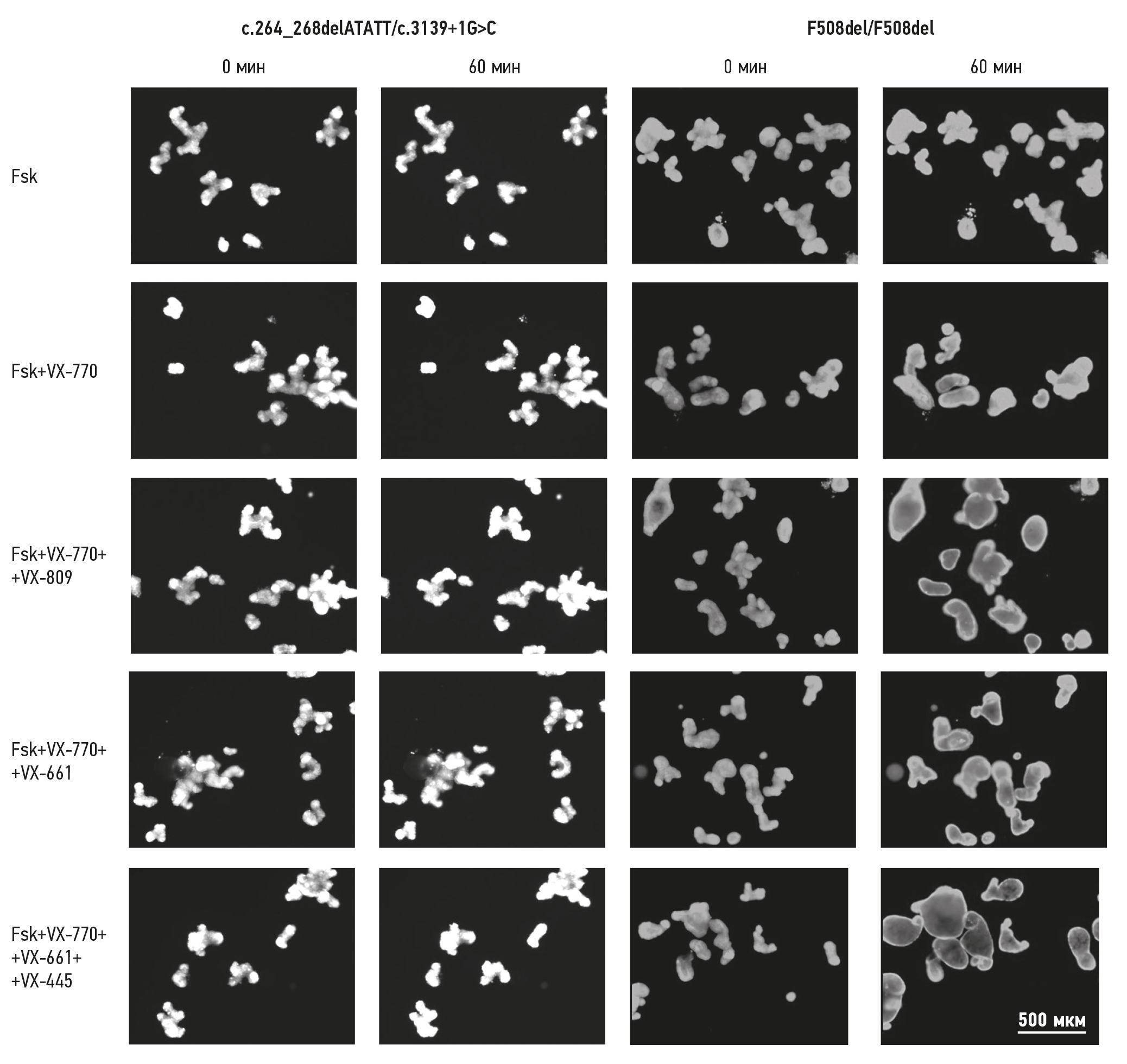 Оценку влияния таргетных препаратов проводили с использованием форсколинового теста на кишечных органоидах. За день до теста кишечные органоиды высевали в каплях Матригеля в 96-луночные планшеты, на этом этапе в соответствующие лунки добавляли корректоры VX-809 (лумакафтор), VX-661 (тезакафтор), VX-445 (элексакафтор) — все в концентрации 3,5 мкМ (Selleckchem, США). Обработке форсколином (Sigma-Aldrich, США) предшествовала стадия 30-минутного окрашивания кальцеином (0,84 мкМ; Biotium, США). Потенциатор VX-770 (3,5 мкМ; Selleckchem, США) добавляли одновременно с форсколином. Кишечные органоиды инкубировали с форсколином и таргетными препаратами в течение 1 ч и одновременно осуществляли съёмку «фиксированных» полей с 10-минутным интервалом на флуоресцентном микроскопе Axio Observer 7 (Zeiss, Германия). Каждый эксперимент повторяли три раза, число повторов для каждого образца в рамках одного эксперимента (n) составляло 6–8. Количественный анализ набухания органоидов проводили при помощи программы Image J, статистическую обработку полученных данных — с помощью программы Sigma Plot 12.5. В качестве контроля использовали культуру органоидов, полученную от пациента с генотипом F508del/F508del (c.1521_1523delCTT/c.1521_1523delCTT). Все этапы культивирования проводили при 37 оС и 5% СО2.