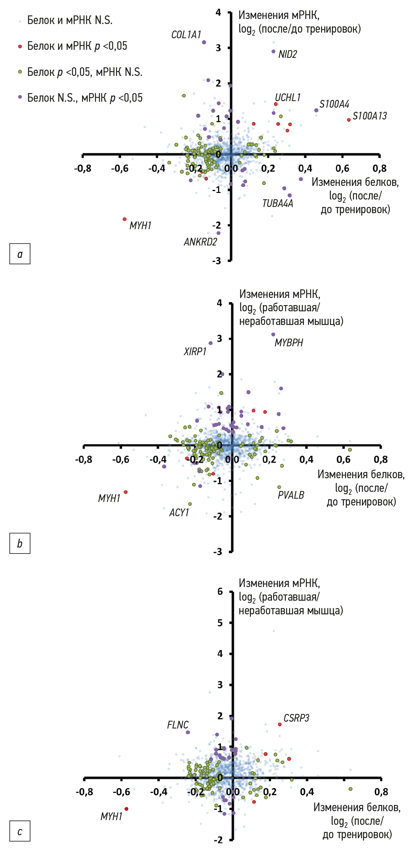 Заключение. Протеомный анализ показал, что 12-недельная силовая тренировка оказала слабое влияние на относительное содержание высокопредставленных белков в мышце. Прирост мышечной массы, вызванный тренировкой, по-видимому, объясняется одинаковым изменением скорости синтеза/деградации детектированных белков. Сопоставление протеомных данных с изменениями экспрессии мРНК после 12-недельной тренировки, а также через 8 и 24 ч после однократной нагрузки (ответ генов, специфический для сократительной активности) показало, что изменение содержания белков, вызванное силовой тренировкой, регулируется преимущественно на посттранскрипционном уровне.