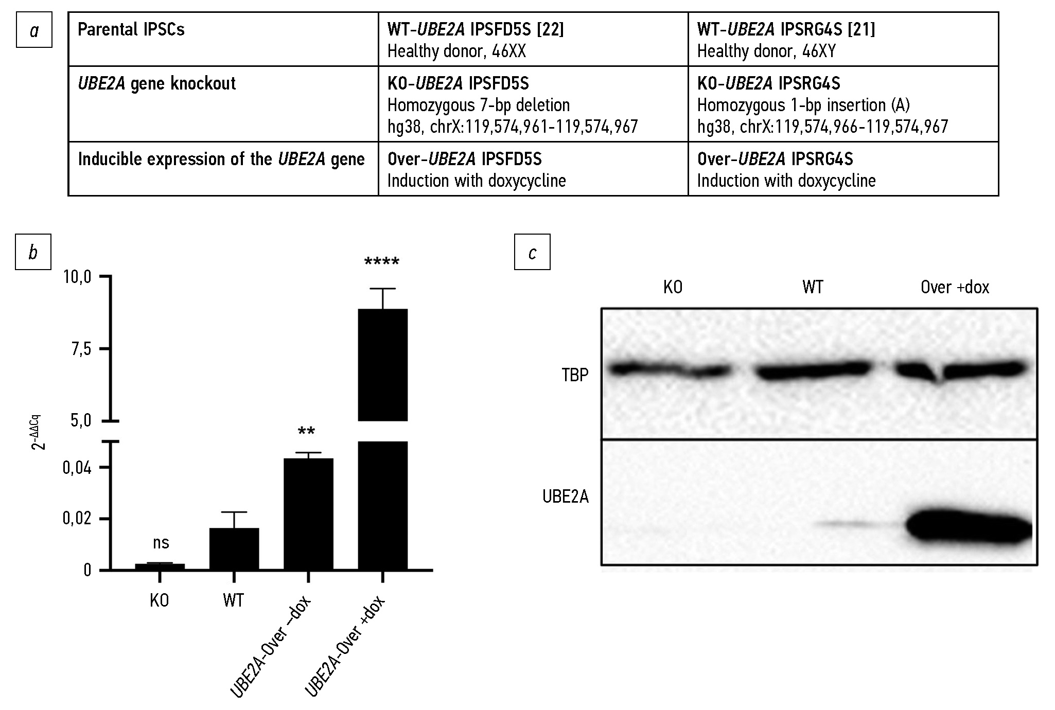 METHODS: Using genomic CRISPR-Cas9 editing and lentiviral transduction, a cell model based on iPSCs from two healthy donors was designed. This cell model includes isogenic iPSCs with knockout and inducible hyperexpression of UBE2A. In addition, iPSCs were obtained by reprogramming peripheral blood mononuclear cells of a patient diagnosed with X-linked mental retardation of Nascimento type, which has a deletion spanning the whole UBE2A locus.