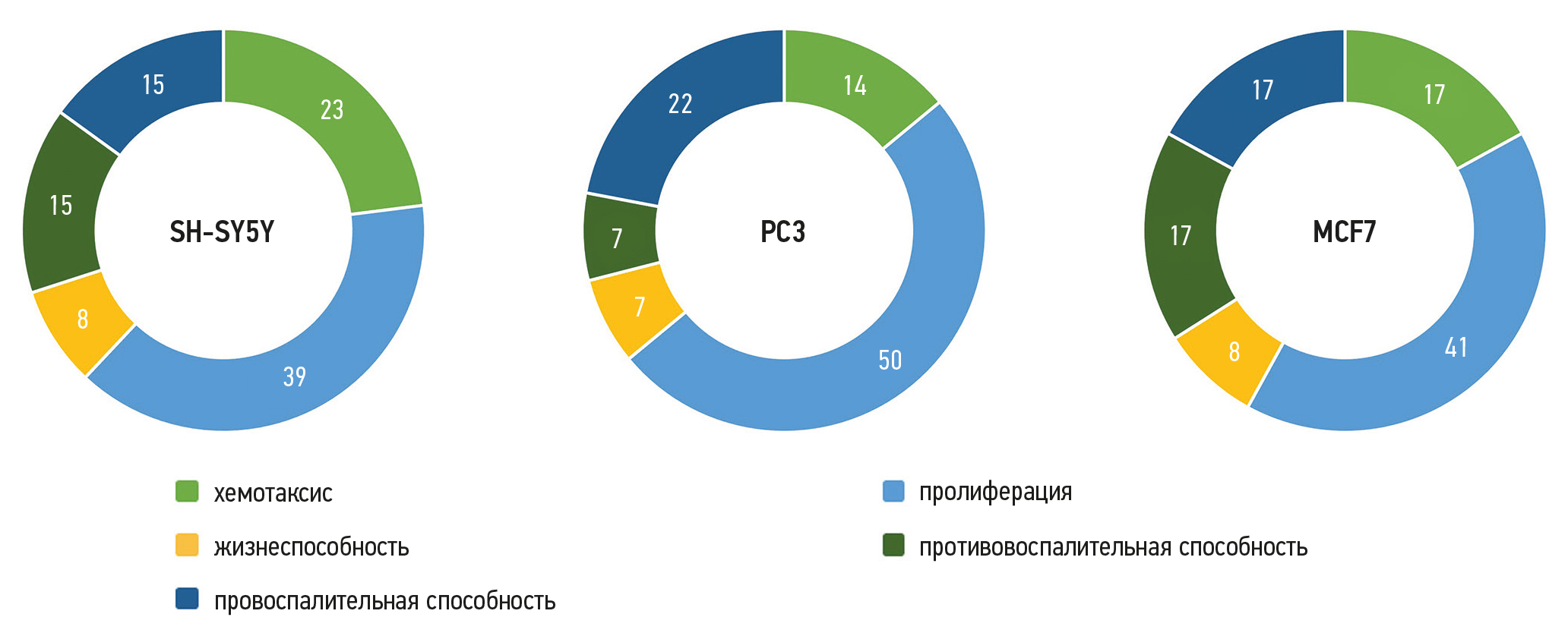 Далее нами был проведён литературный поиск для определения молекулярных путей и функций, в которых задействованы вышеуказанные молекулы (рис. 1). Интересно отметить, что исследованные в клетках факторы SH-SY5Y, PC3 и MCF7 в большей степени участвуют в индукции пролиферации, способствуют хемотаксису и отвечают за провоспалительную способность.