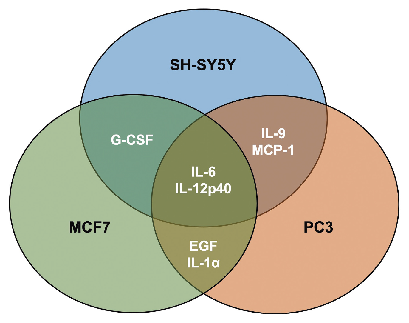 Fig. 2. Venn diagram showing intersections of increasing analyte concentrations in recipient SH-SY5Y, PC3, MCF7 cells after addition of induced mesenchymal stem cell membrane vesicles.