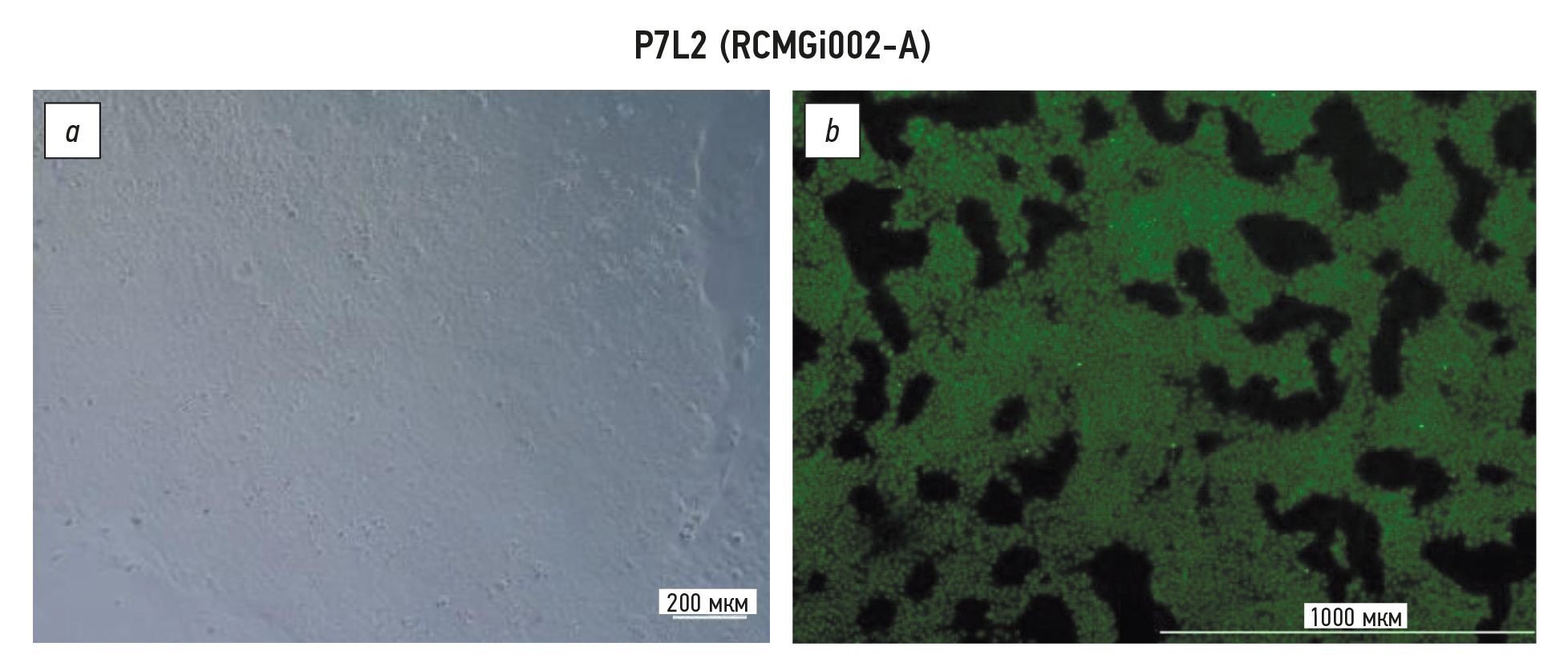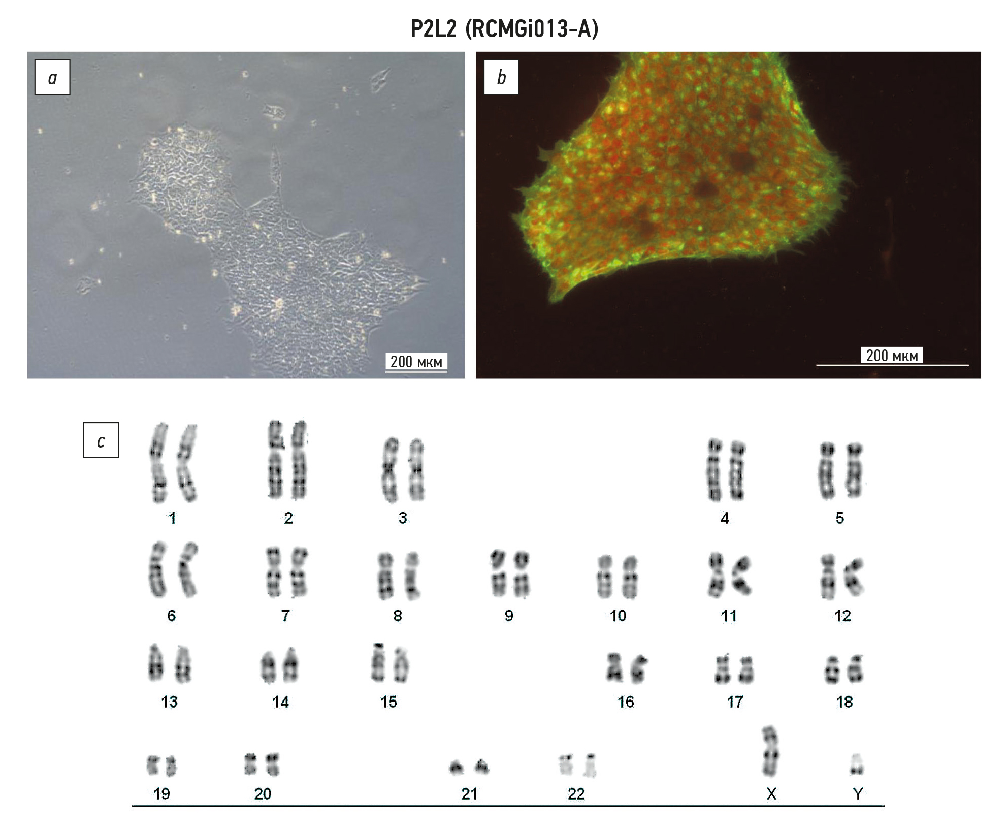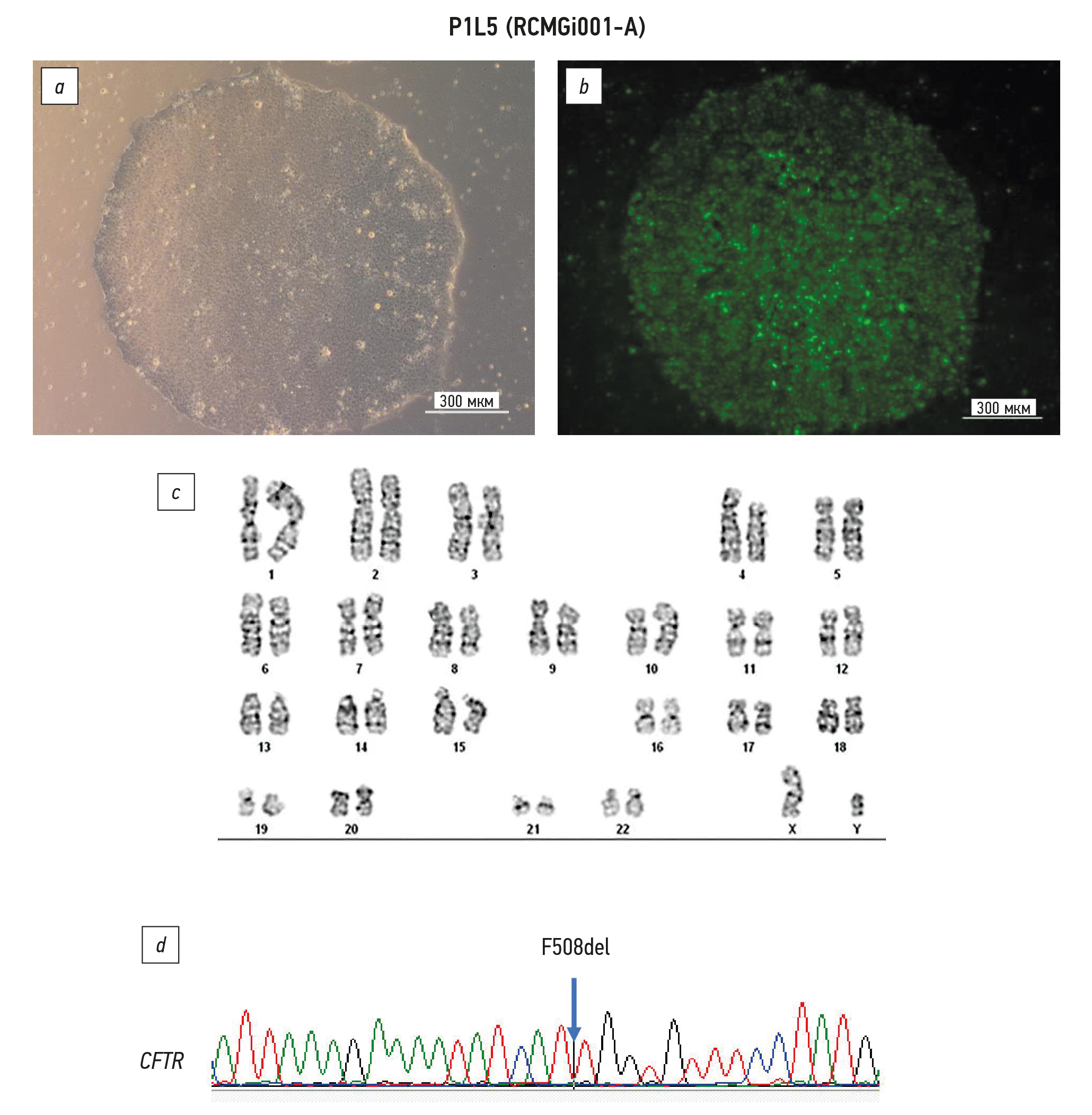 Из биопсийного материала кожи трёх пациентов (№№ 1, 2 и 7) с муковисцидозом, обусловленным гомозиготной мутацией F508del, были получены линии фибробластов с использованием пролиферативной среды «Амниокар» («ПанЭко», Россия). Все участники либо их официальные представители до включения в исследование добровольно подписали форму информированного согласия, утверждённую в составе протокола исследования этическим комитетом ФГБНУ «МГНЦ» (протокол № 1 от 28.01.2016 г.). Далее из этих фибробластов были созданы три линии чиПСК путём репрограммирования, для чего использовали наборы CytoTune™-iPS 2.0 Sendai Reprogramming Kit (Thermo Fisher Scientific, США) и ReproRNA™-OKSGM Kit (STEMCELL Technologies, Канада) согласно протоколам производителей. чиПСК культивировали в среде Essential 8™ (Gibco, США) на культуральном пластике, покрытом Matrigel (Corning, США), при 37 °C и 5% CO2. Каждые 4–10 дней в зависимости от конфлюэнтности клетки пересевали с помощью раствора Версена («ПанЭко», Россия), добавляя в среду при каждом пересеве на 24 ч ингибитор ROCK Y-27632 (STEMCELL Technologies, Канада) в концентрации 5 мкМ. Полученные три линии чиПСК (P1L5, P2L2 и P7L2) были полностью охарактеризованы, включая генотипирование и кариотипирование, анализ экспрессии маркёров плюрипотентности и способности к дифференцировке в три зародышевых листка, и зарегистрированы в базе hPSCreg под номерами RCMGi001-A (рис. 1), RCMGi0013-A (рис. 2) и RCMGi002-A (рис. 3). Для всех линий были подтверждены наличие мутации F508del в гомозиготном состоянии методом секвенирования по Сэнгеру, нормальный кариотип методом GTG-бэндинга, экспрессия маркёров плюрипотентности (NANOG, SSEA4, SOX2, OCT-4) методом иммуноцитохимии, функциональная плюрипотентность методом спонтанной дифференцировки и иммуноцитохимии (экспрессия маркёров эндодермы — альфа-фетопротеина или FOXA2, эктодермы — кератина-76 или бета-III-тубулина, мезодермы — виментина или фибронектина), а также родственность с исходной линией методом STR-анализа.