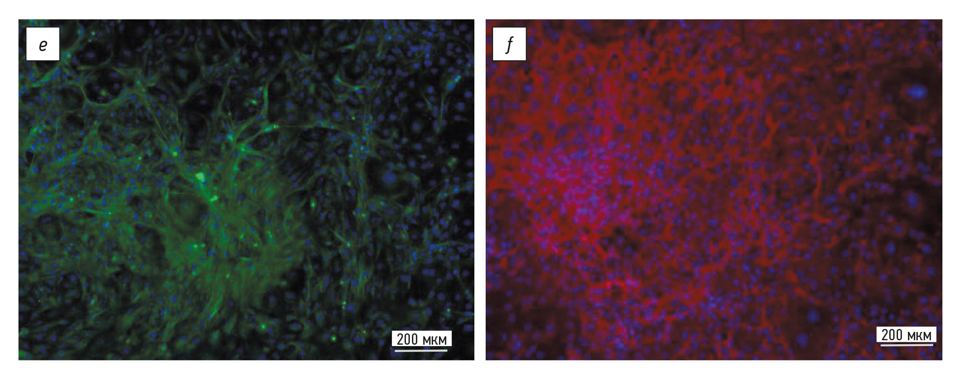 Рис. 1. Морфология и характеристика линии индуцированных плюрипотентных стволовых клеток человека P1L5: a — морфология колонии индуцированных плюрипотентных стволовых клеток; b — прижизненная окраска колонии индуцированных плюрипотентных стволовых клеток на маркёр плюрипотентности TRA-1-60; c — кариотип линии индуцированных плюрипотентных стволовых клеток; d — секвенограмма локуса CFTR с мутацией F508del; e — иммуноцитохимическое окрашивание клеток на бета-III-тубулин (зелёный) и DAPI (синий); f — иммуноцитохимическое окрашивание клеток на фибронектин (красный) и DAPI (синий).