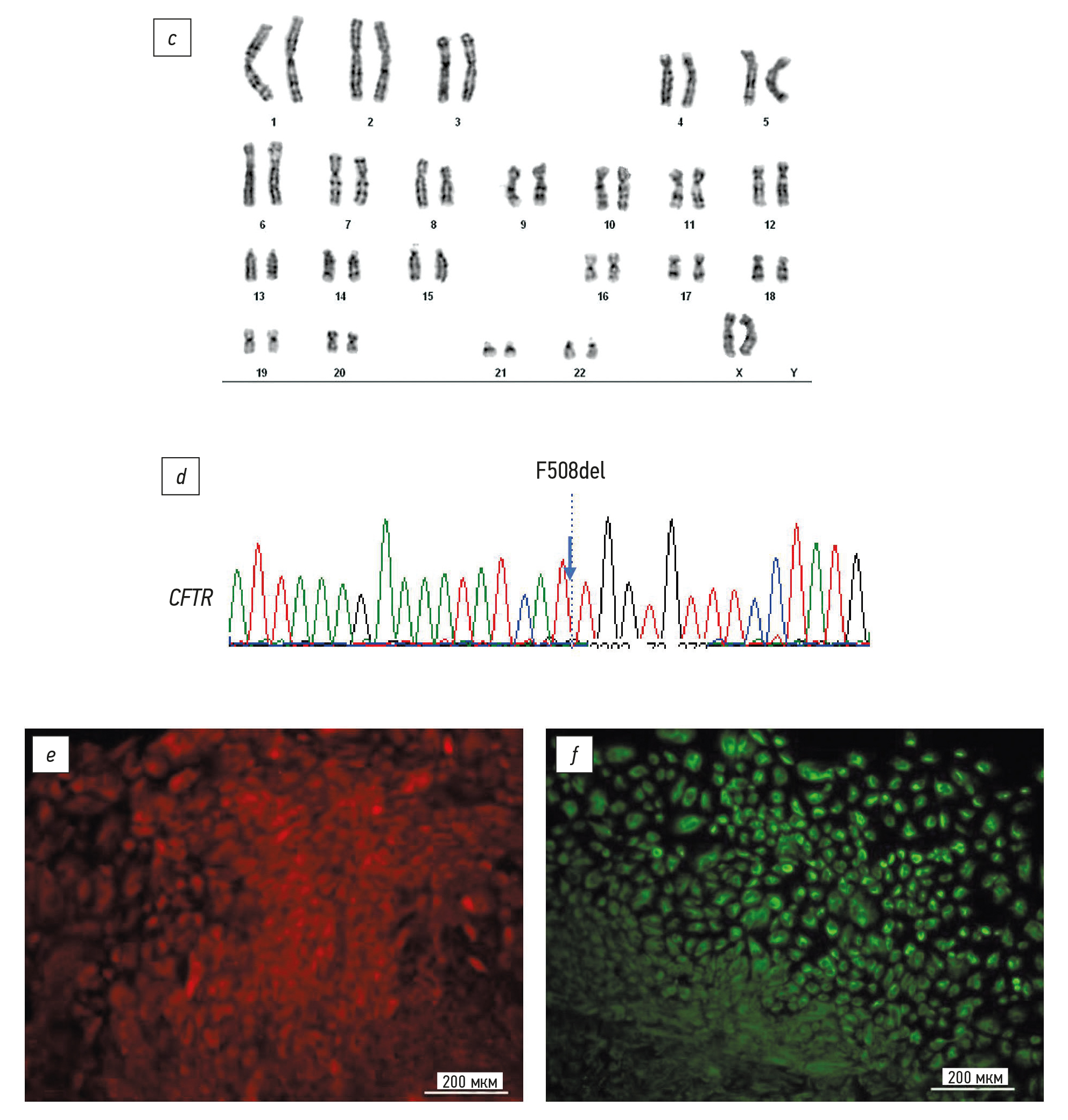 Рис. 3. Морфология и характеристика линии индуцированных плюрипотентных стволовых клеток человека P7L2: a — морфология колонии индуцированных плюрипотентных стволовых клеток; b — окраска индуцированных плюрипотентных стволовых клеток на маркёр плюрипотентности SOX2; c — кариотип линии индуцированных плюрипотентных стволовых клеток; d — секвенограмма локуса CFTR с мутацией F508del; e — иммуноцитохимическое окрашивание клеток на кератин-76; f — иммуноцитохимическое окрашивание клеток на виментин.