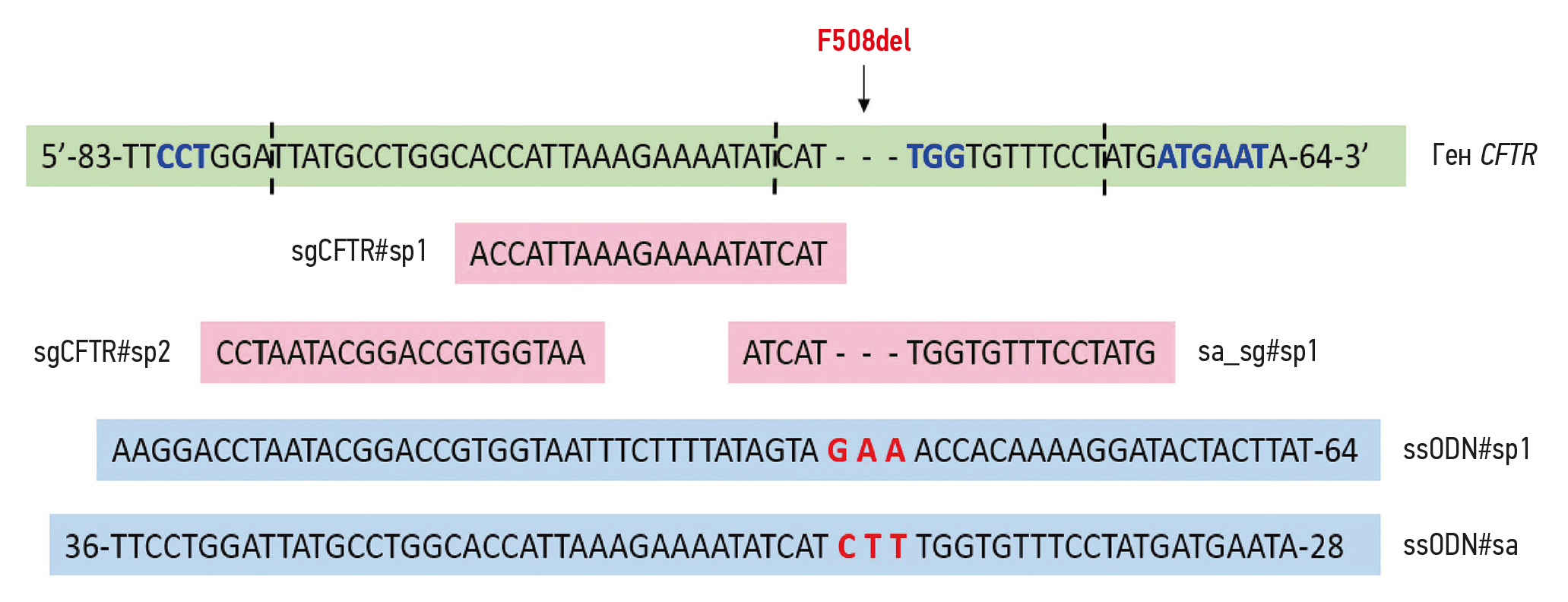 Рис. 4. Схема расположения подобранных направляющих РНК (sgCFTR#sp1, sgCFTR#sp2 и sgCFTR#sa, выделены розовым) и одноцепочечных олигодезоксирибонуклеотидов (ssODN#sp1 и ssODN#sa, выделены голубым; красными буквами показаны три недостающих нуклеотида, которые будут добавлены в геном за счёт одноцепочечного олигодезоксирибонуклеотида при гомологичной репарации) относительно локуса CFTR (выделен зелёным; синими буквами показаны PAM-последовательности для направляющей РНК). Стрелкой указано положение мутации F508del, подлежащей коррекции.