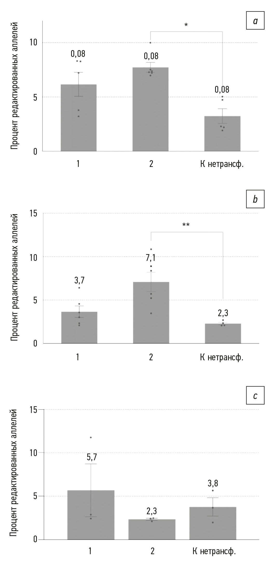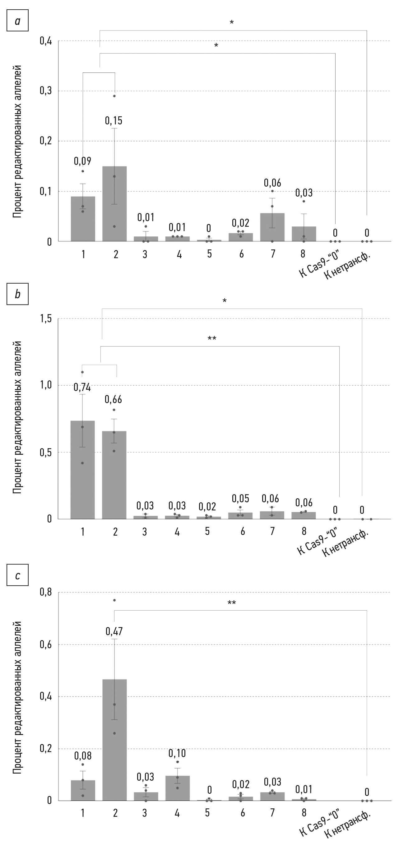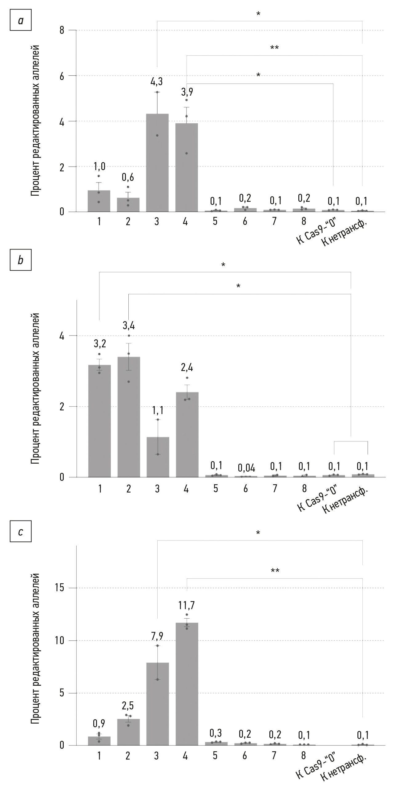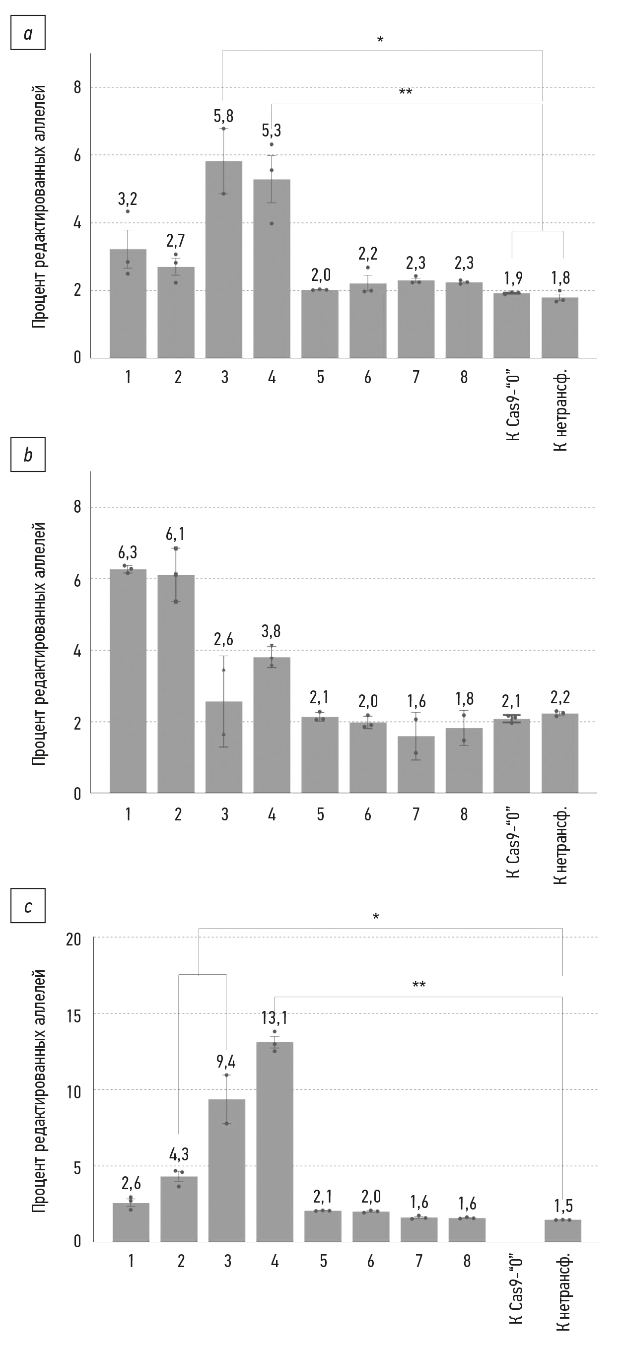 Fig. 8. Non-homologous end joining levels in three human induced airway basal stem cells lines: a — P1L5 line, b — P2L2 line, c — P7L2 line. The numbers on the Y-axis correspond to the numbers of the editing systems in Table 3. “К нетрансф.” means the untransfected control. Mean ± SEM (n=3–6); * p <0.05; ** p <0.01.