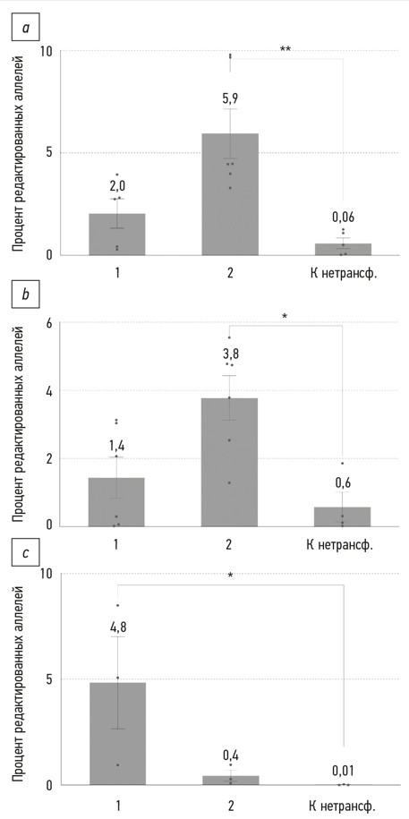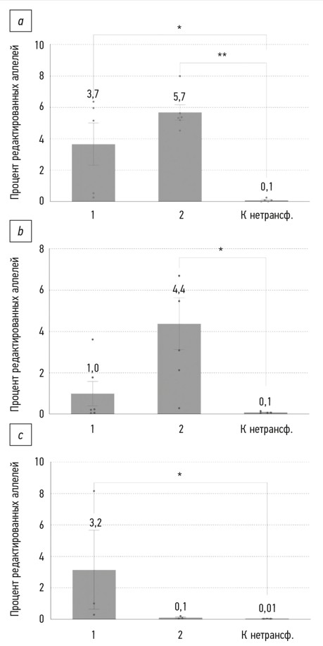 Fig. 10. Directed homologous repair levels in three human induced airway basal stem cells lines: a — P1L5 line, b — P2L2 line, c — P7L2 line. The numbers on the Y-axis correspond to the numbers of the editing systems in Table 3. “К нетрансф.” means the untransfected control. Mean ± SEM (n=3–6); * p <0.05; ** p <0.01.
