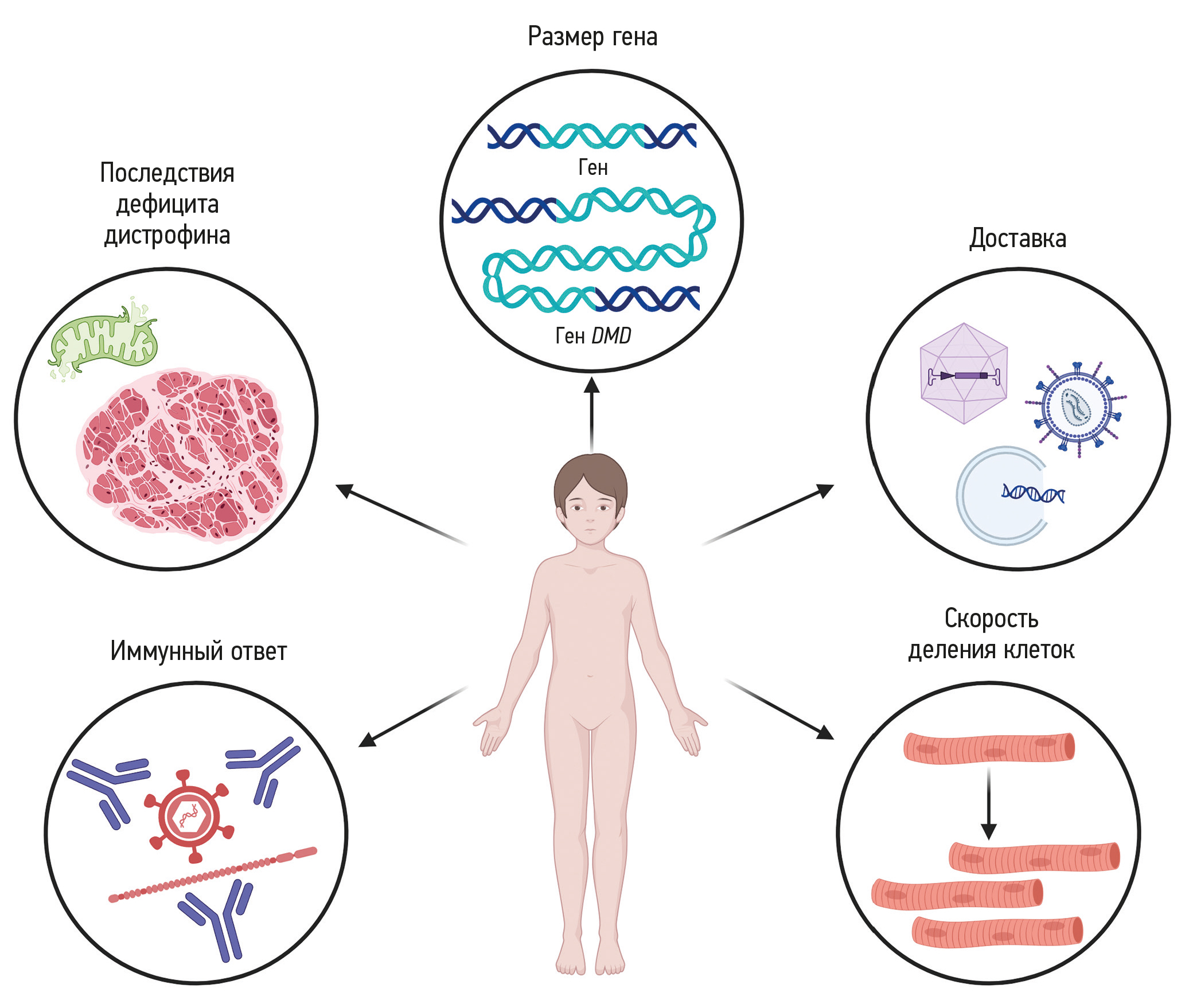 Изучение различных вариантов микродистрофина с использованием векторов на основе различных серотипов AAV продолжается и в настоящее время [47]. Для достижения высокой эффективности такой терапии, как было описано выше, необходимо использовать достаточно высокую дозу препарата, что обеспечивается высокой дозой вирусных векторов. Это связано с тем, что количество вирусных векторов рассчитывается исходя из массы тела, а средний возраст пациента с МДД, получающего лечение, составляет 4–5 лет. В России средний возраст постановки диагноза — 6,5 года [48], соответственно для более взрослых пациентов будет необходим ещё больший объём вируса, который с большей вероятностью может спровоцировать нежелательную иммунную реакцию (подробнее об этом рассмотрено далее). По результатам первой фазы клинических исследований микродистрофина (деландистроген моксепарвовек*) в большинстве мышечных волокон наблюдалась его устойчивая экспрессия [45]. Но результаты третьей фазы показали отсутствие статистически значимых различий между группами пациентов, принимающих препарат или плацебо. Ввиду вышесказанного можно предположить, что даже значимого повышения экспрессии укороченной формы дистрофина недостаточно для компенсации функции полноразмерного белка [37]. Однако для подобных выводов необходимо дождаться клинических исследований других препаратов на основе микродистрофина, и, возможно, более длительное наблюдение за пациентами позволит достигнуть статистической значимости результатов. Кроме того, в последнее время активно разрабатываются альтернативные способы доставки, такие как нановезикулы. Они имеют высокую биосовместимость и способны преодолевать различные тканевые барьеры. Кроме того, нановезикулы обладают высокой пакующей способностью, благодаря чему могут потенциально применяться для доставки кДНК полноразмерного дистрофина [49].