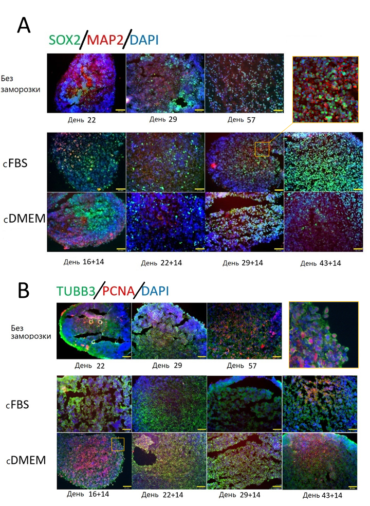 Для предварительного эксперимента нейральные органоиды замораживали на 8, 10, 15, 18, 20 и 22-й день от начала дифференцировки, используя среды 1, 2 и 3 (табл. 1). Для финального эксперимента органоиды среднего мозга замораживали на 9, 14, 22, 29 и 43-й день после сворачивания в сфероиды и начала дифференцировки. Для этого предварительно готовили среды 2 и 4 для криоконсервации (см. табл. 1). В качестве контрольной группы использовали незамороженные органоиды в соответствующие дни.