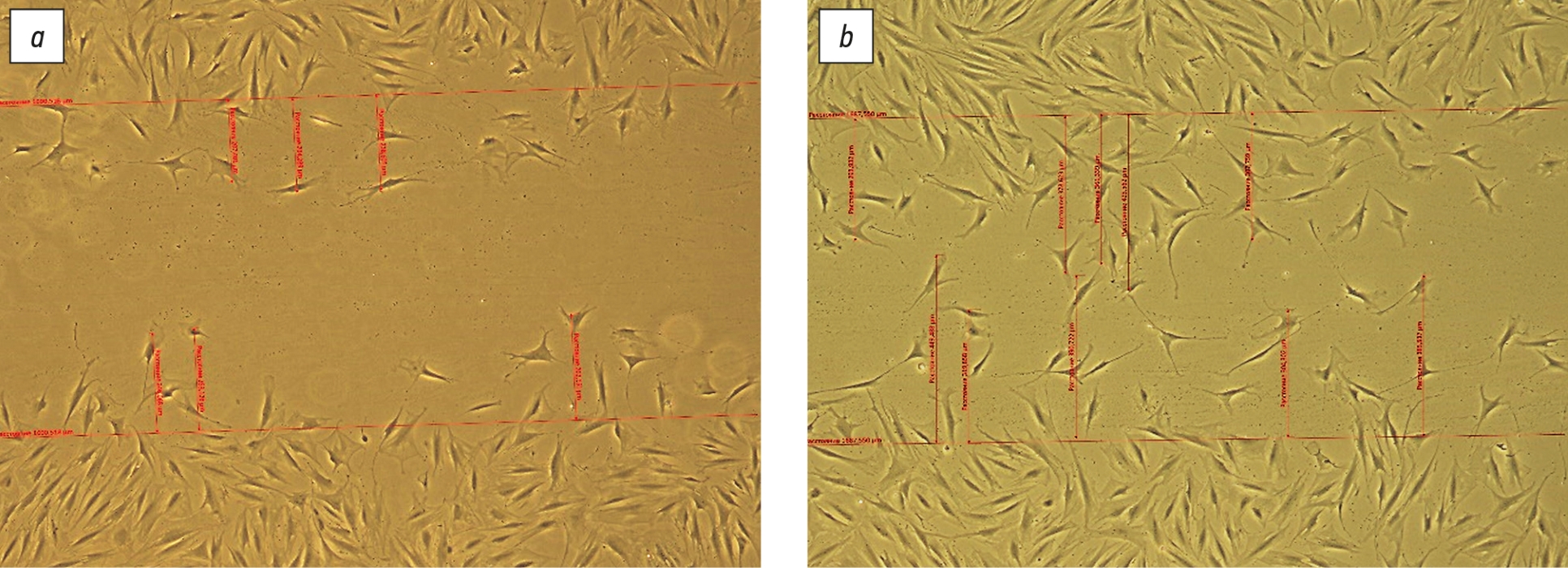 Рис. 2. Оценка миграции фибробластов кожи через 24 ч, мкм: a — контроль (n=40); b — в культуре с добавлением серотонина (n=40); ×50.