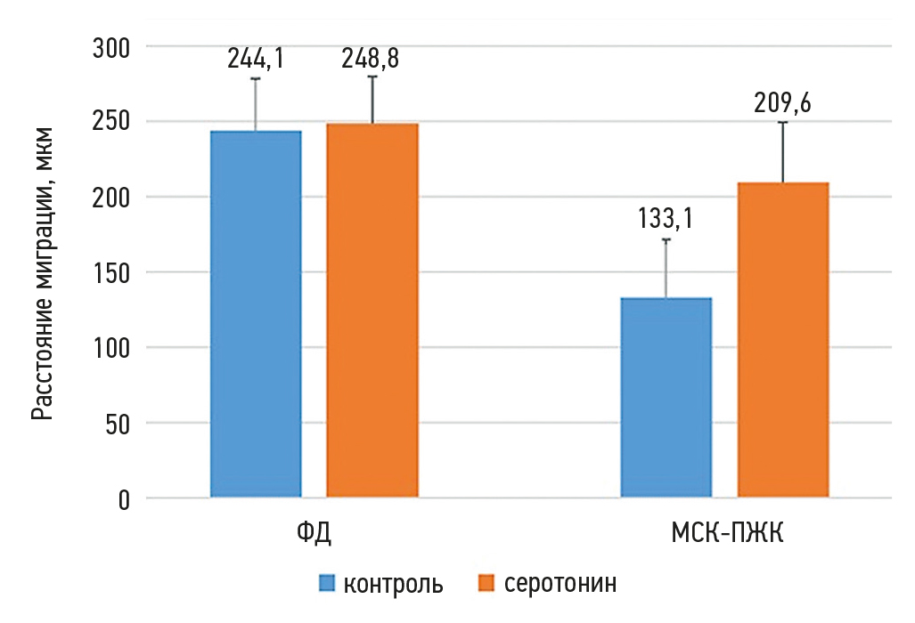 Результаты. Как ФД, так и МСК-ПЖК отреагировали на введение в стандартную среду серотонина повышением пролиферации. В результате подсчёта количества мигрировавших клеток выявлено повышение условной скорости перемещения МСК-ПЖК в условиях добавления серотонина. Отмечено также меньшее количество клеток, подвергшихся некрозу и апоптозу, в культурах клеток с добавлением в среду серотонина.