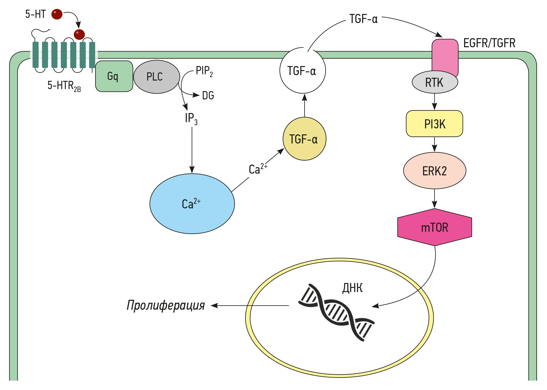 Рис. 5. Пути внутриклеточной сигнализации 5-HTR через аутокринную TGF-α-зависимую стимуляцию активации синтеза ДНК и пролиферации. 5-HT — 5-гидрокситриптамин/серотонин; 5-HTR — 5-HT-рецепторы, RTK — рецепторная тирозинкиназа; PLC — фосфолипаза C; PIP2 — фосфатидилинозитол-4,5-бисфосфат; DG — диацилглицерин; IP3 — инозитол-1,4,5-трифосфат; PI3K — фосфоинозитид-3-киназа; ERK2 — киназа 2, регулируемая внеклеточным сигналом; mTOR — мишень рапамицина у млекопитающих; TGF-α — трансформирующий фактор роста α.
