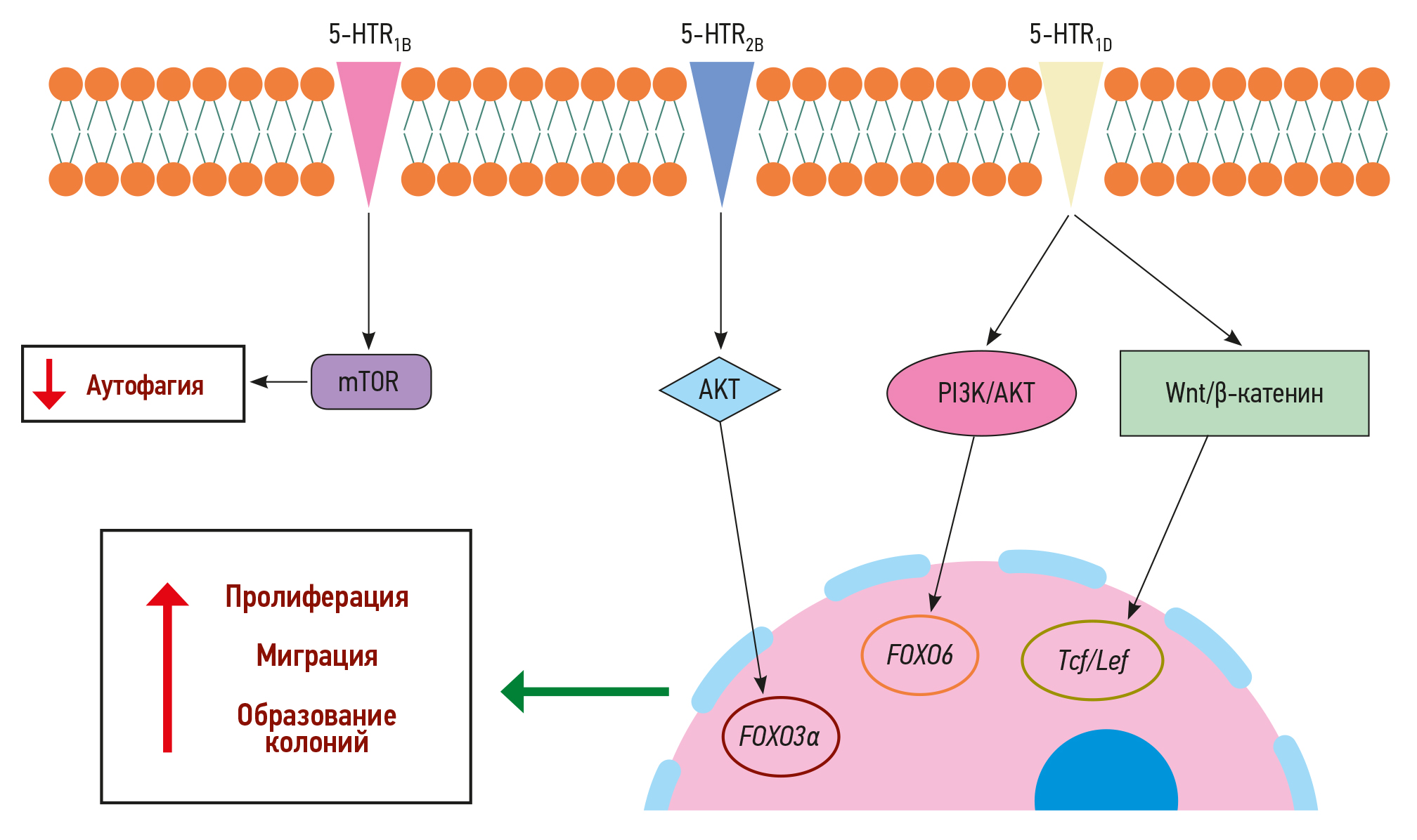 Попытка объяснения механизмов регенераторных эффектов серотонина была предпринята в серии исследований K. Naito и соавт. [26] и M. Kimura и соавт. [27], где авторы обнаружили, что 5-HT стимулирует аутокринную секрецию TGF-α из гепатоцитов через путь 5-HT2B/Gq/фосфоинозитид-специфической фосфолипазы C/Ca2+, а секретируемый TGF-α напрямую стимулирует синтез ДНК и пролиферацию гепатоцитов (рис. 5). Механизм пролиферативного эффекта серотонина и активации миграции был наиболее детально изучен также на клетках гепатоцеллюлярной карциномы [28]. Активация рецептора 5-HTR1D подтипа запускает реакции активации Tcf/Lef, в результате которых происходит накопление β-катенина, что приводит к запуску пролиферации и дифференцировки клеток (рис. 6). Активация рецептора 5-HTR1D подтипа также может активировать FOXO6 через путь PI3K/AKT, что наряду с активацией пути AKT/FOXO3α через 5-HTR2B способствует пролиферации, образованию колоний, миграции клеток гепатоцеллюлярной карциномы. Сигнализация через 5-HTR1D также увеличивает экспрессию белков, связанных с путём Wnt/β-катенина, и целевых генов, ассоциированных с избыточной пролиферацией у опухолевых клеток, включая β-катенин, сурвивин, C-myc и циклин D1. Эти пути также активируют комплекс mTOR и таким образом приводят к ингибированию процесса аутофагии, что является дополнительным фактором, обусловливающим позитивное влияние серотонина на пролиферацию [18].
