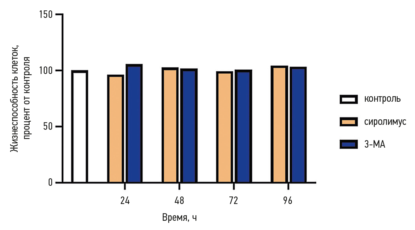 Для оценки жизнеспособности ММСК высевали в 96-луночные планшеты (Corning® 96-Well High-Binding Flat-Bottom Microplate; STEMCELL Technologies, Канада) в количестве 3000 кл./лунку. Клетки культивировали при 37 °C в течение 24, 48, 72, 96 ч с каждым из модуляторов аутофагии (сиролимус, 3-МА), а также без добавления модулятора. При завершении культивирования производили замену среды с добавлением в лунку 10 мкл соли тетразолия (набор для подсчёта клеток Cell Counting Kit-8 (CCK-8); Servicebio, Китай) и последующей инкубацией при температуре 37 °C в течение 1 ч. После этого оптическую плотность поглощения измеряли при длине волны 450 нм с помощью иммуноферментного анализатора Multiscan FC (Thermo Fisher Scientific, США).