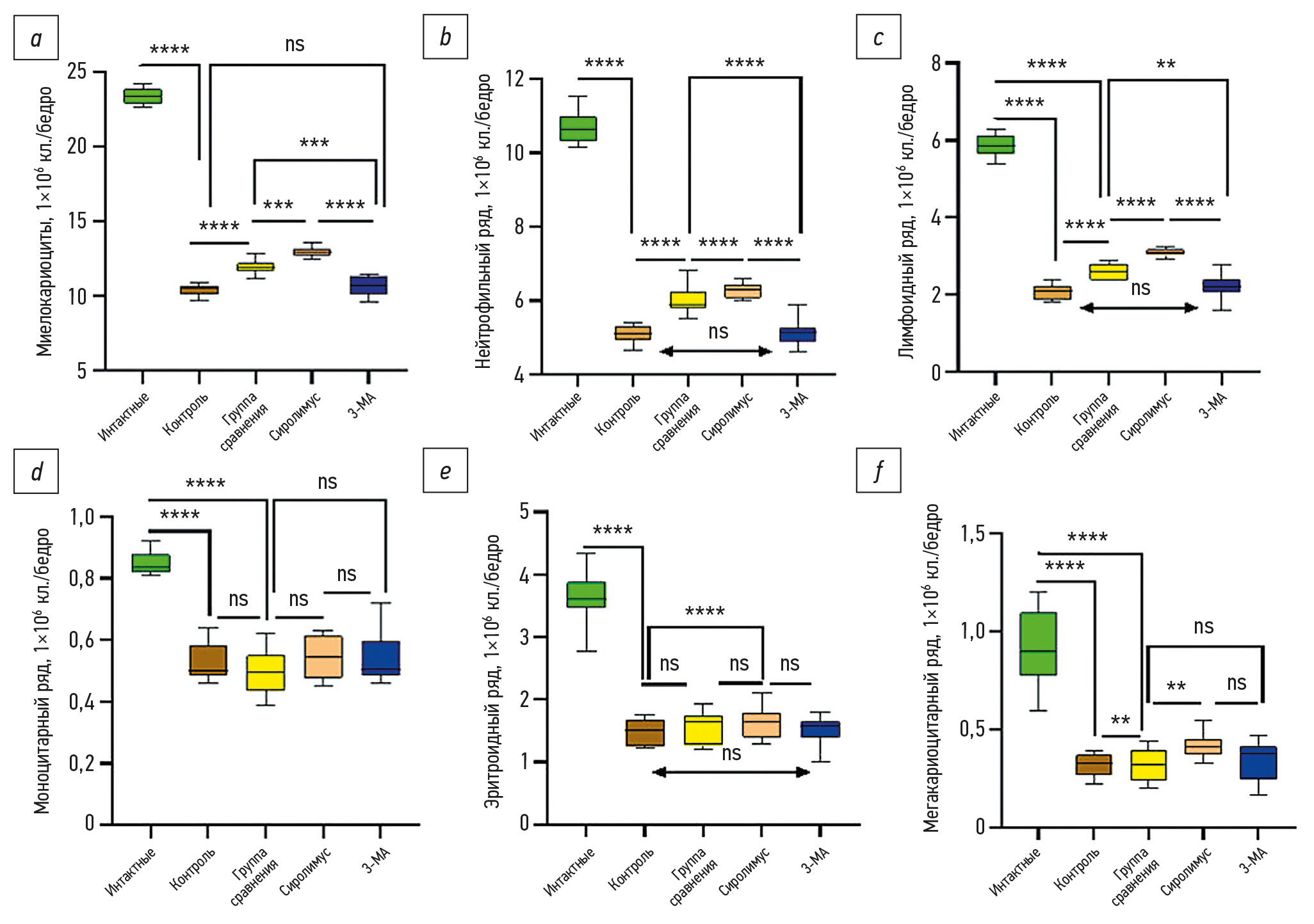 Рис. 4. Клеточный состав костного мозга лабораторных животных на 7-е сутки острой лучевой болезни: a — количество миелокариоцитов — общая популяция незрелых миелоидных предшественников, включая миелобласты, промиелоциты и миелоциты; b — количество клеток нейтрофильного ряда — метамиелоцитов, палочкоядерных и сегментоядерных нейтрофилов; c — количество клеток лимфоидного ряда — лимфоцитов, включая В- и Т-клеточных предшественников; d — количество клеток моноцитарного ряда — моноцитов и их предшественников (промоноцитов); e — количество клеток эритроидного ряда — нормобластов на разных стадиях созревания (базофильных, полихроматофильных, оксифильных); f — количество клеток мегакариоцитарного ряда — мегакариоцитов; ** различия статистически значимы при р ≤ 0,01; *** при р ≤ 0,001; **** при р ≤ 0,0001; ns — нет статистически значимых различий. Интактные — группа лабораторных животных, не подвергшихся ионизирующему излучению; Контроль — не проводилась трансплантация клеток; Группа сравнения — с трансплантацией мультипотентных мезенхимальных стромальных клеток (ММСК) без модулирования в них аутофагии; Сиролимус — проведена трансплантация ММСК с активированной в них аутофагией сиролимусом; 3-МА — проведена трансплантация ММСК с ингибированной в них аутофагией 3-метиладенином.