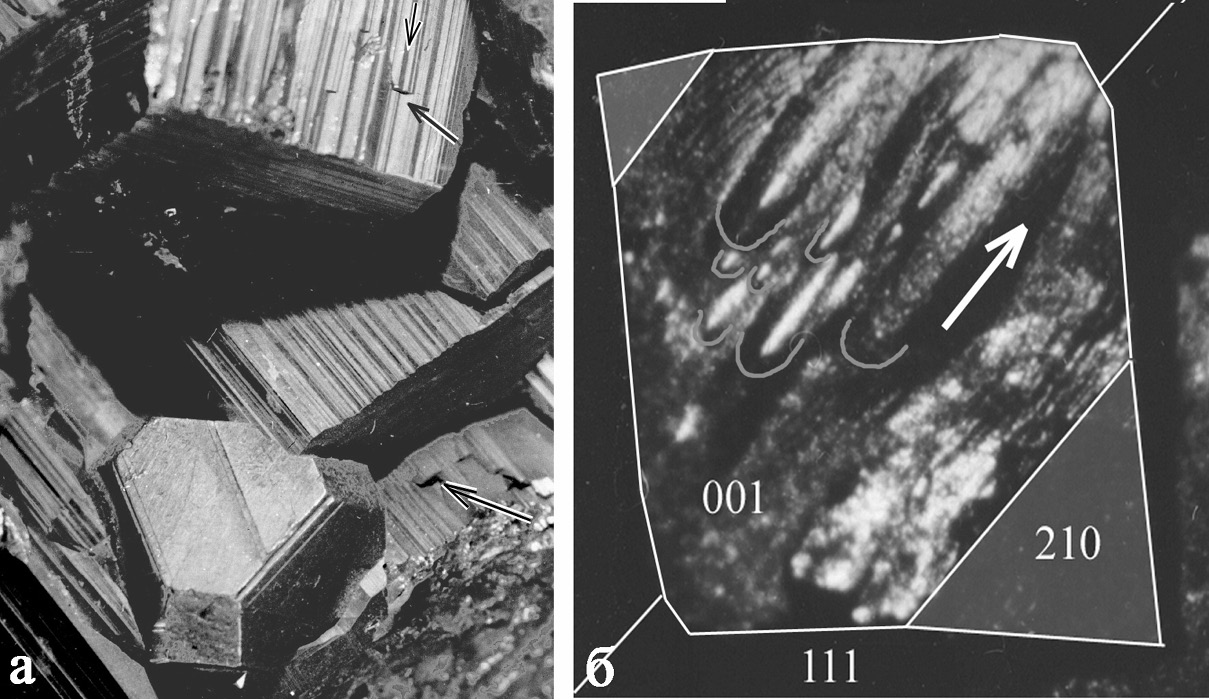 Рис. 2. Штриховка изменения формы (100) → (210) с направленным набеганием слоев роста на кристаллах пирита: а – ступеньки на штрихах; б – разная относительная скорость набегания слоев в противоположные стороны от исходной вершины бугра.