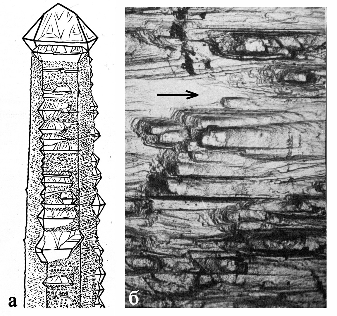 Рис. 3. Зарождение новых бугров (субиндивидов) роста на ребре с выходом отрицательного конца двойных осей кварца (а) и движение слоев роста с большей относительной скоростью в сторону положительного ребра гексагональной призмы кристалла кварца (б).