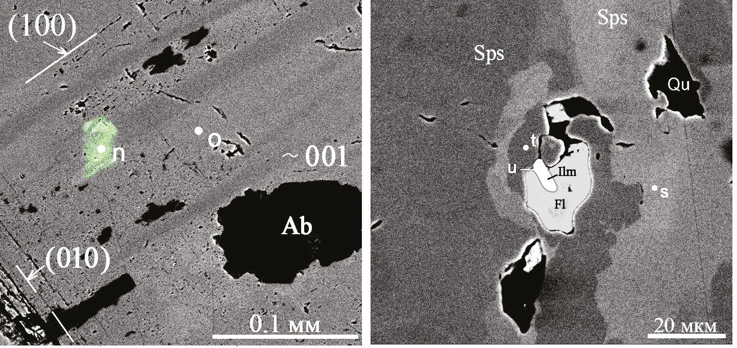 Рис. 7. Зонально-секториальный амазонит (слева) и зональный спессартин (справа) из жилы гранитного пегматита копи № 63 Ильменского государственного заповедника. Ab – альбит, Sps – спессартин, Qu – кварц, Ilm – ильменит, Fl – флюорит. Здесь и на рис. 8, 9 и 11, BSE-фото.