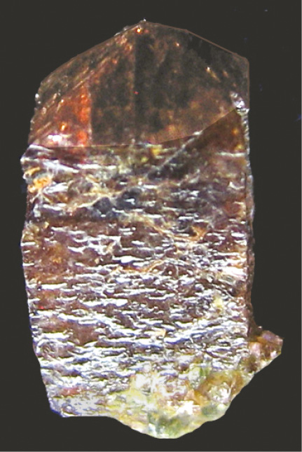Fig. 10. Zircon crystal with many vicinal facets (331) on rough growth knobs of the tetragonal prism (110). The vicinal facets are set on the reflection. The size of the crystal is 1.5 cm. Mine no. 97.