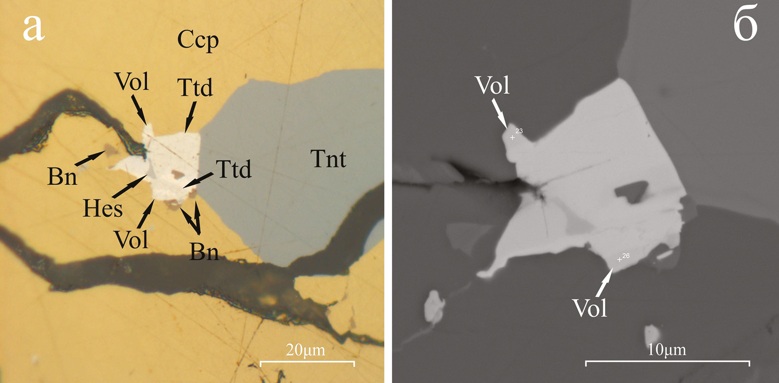 Волынскит AgBiTe2 обнаружен в одном образце из глубоких горизонтов месторождения (973.1 м) в ассоциации с гесситом, тетрадимитом, теллуровисмутитом и висмутсодержащей блеклой рудой (рис. 4). Волынскит образует тонкие и короткие (от 2 до 5–7 мкм) каймы по краям зерен тетрадимита и теллуровисмутита и замещает их. Также в срастании с этими минералами находятся халькопирит, блеклая руда и борнит. Состав изученного минерала близок к теоретическому (табл. 2).